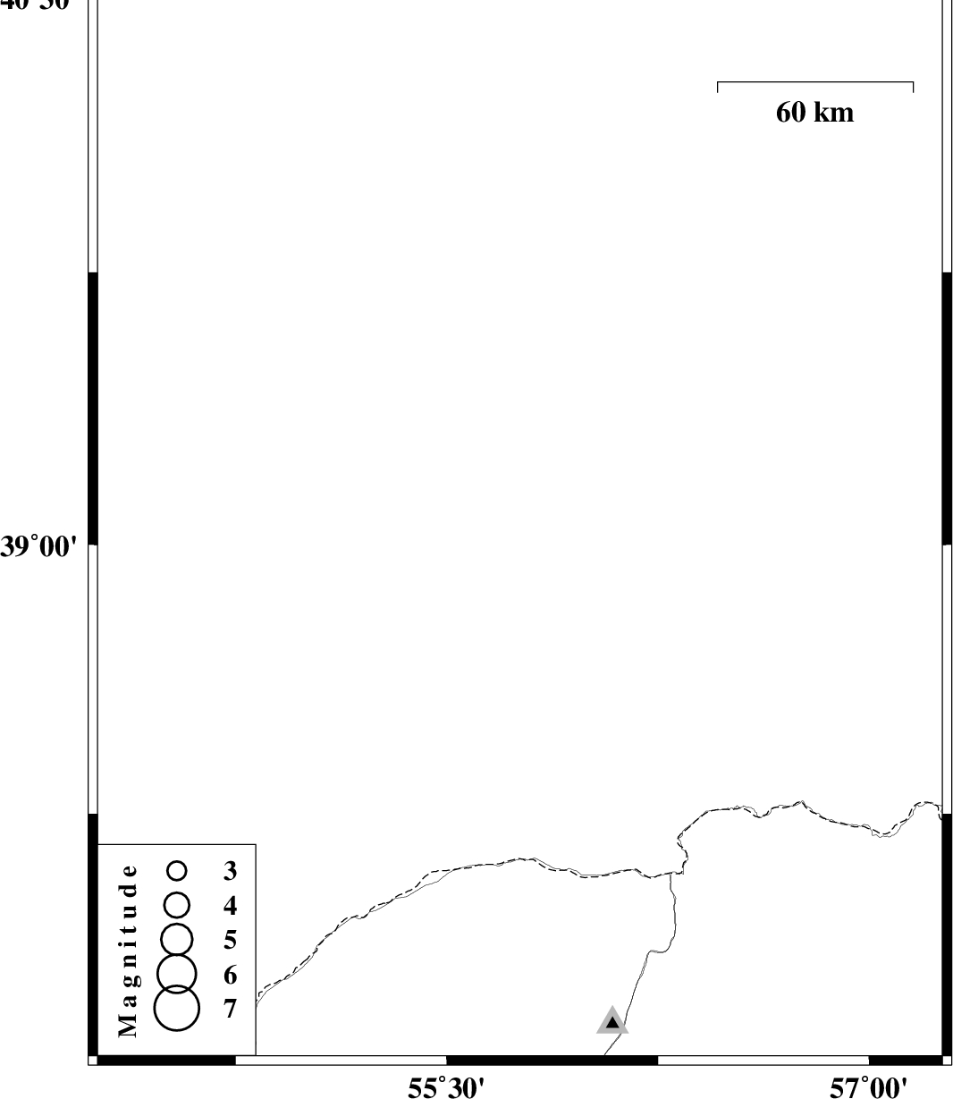 | 2013/02/23 | 23:12:31.4 | 02:42:31.4 | 39.07 | 55.76 | 27 | ML:4.3 | Turkmenistan |
