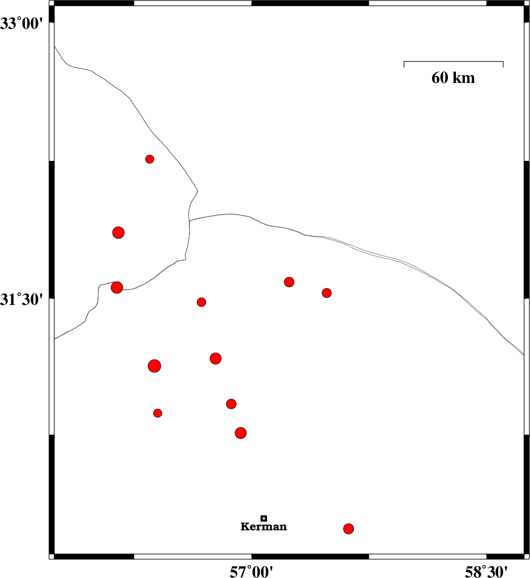 2013/02/10 | 01:56:27.8 | 05:26:27.8 | 30.23 | 57.62 | 18 | ML:2.9 | Kerman Province, 52 km East of Kerman | ||