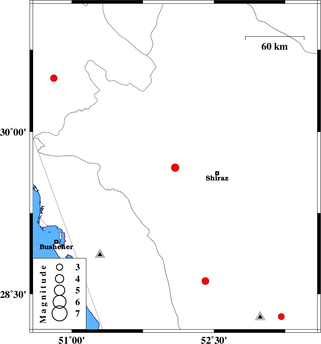| 2013/02/15 | 10:04:31.5 | 13:34:31.5 | 28.62 | 52.41 | 6 | ML:3.4 | Fars Province, 30 km South-West of Firuz Abad |
