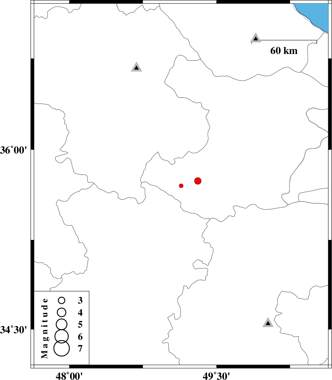 | 2013/02/22 | 07:38:19.7 | 11:08:19.7 | 35.74 | 49.31 | 15 | ML:3.1 | Ghazvin Province, 45 km South of Abhar |