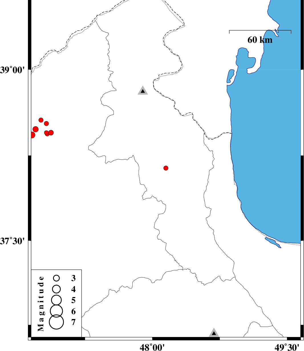 | 2013/02/20 | 10:36:52.9 | 14:06:52.9 | 38.45 | 46.87 | 14 | ML:2.6 | Azarbaijan Sharghi Province, 18 km West of Ahar | ||