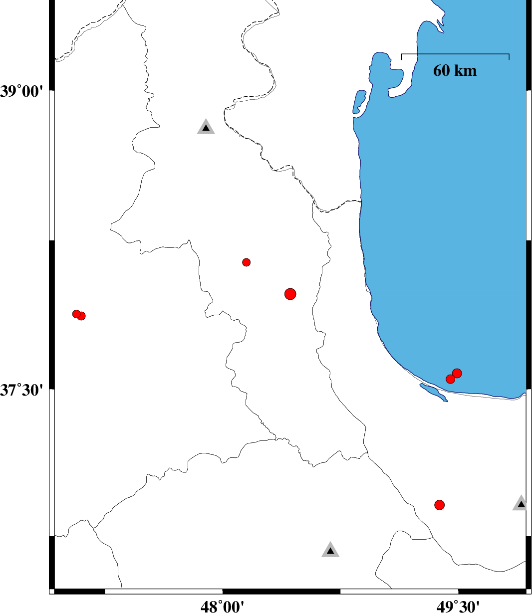 2013/01/29 | 10:51:41.7 | 14:21:41.7 | 37.58 | 49.49 | 14 | ML:2.7 | Caspian Sea, 12 km North of Bandar-e anzali |