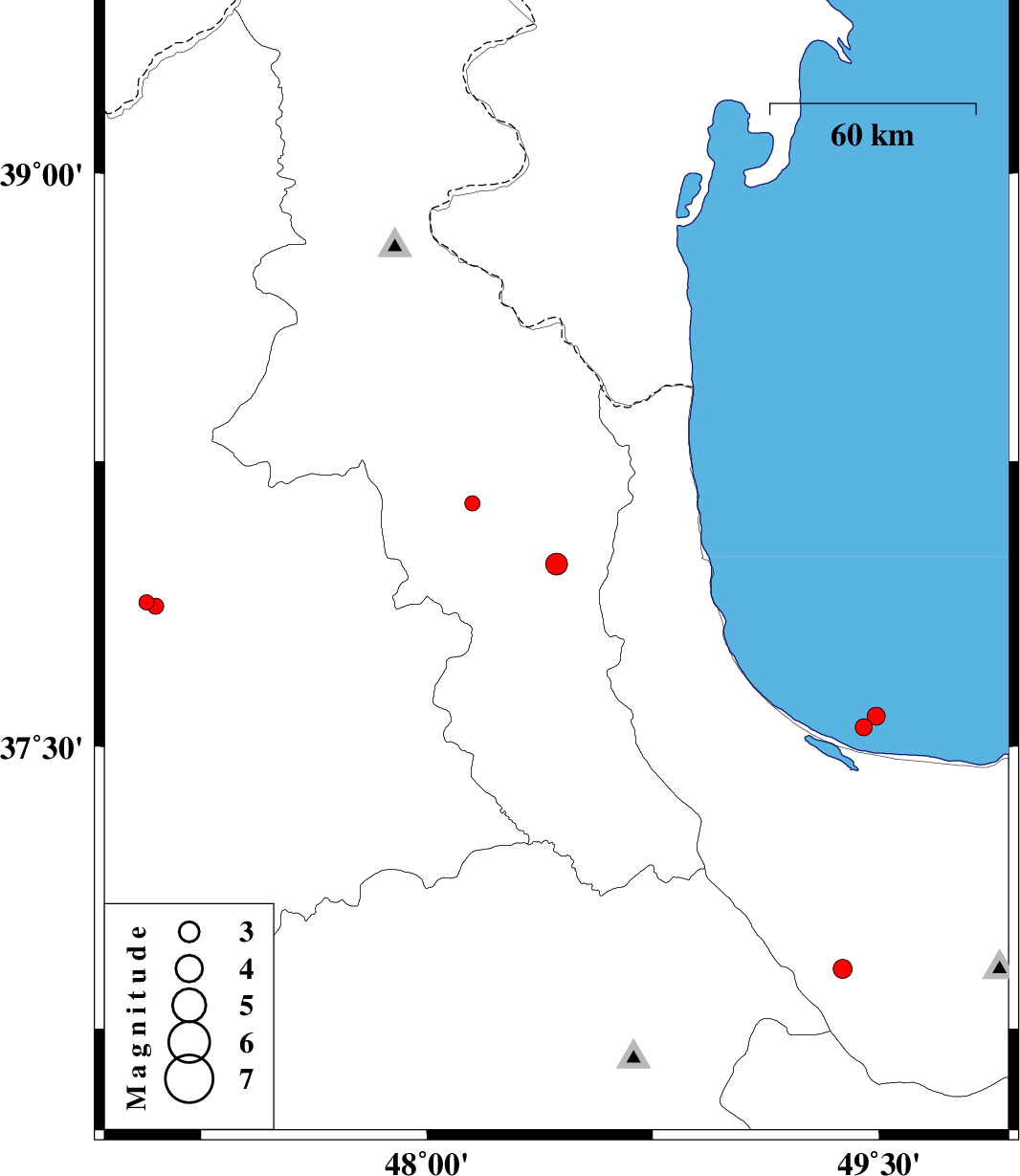 | 2013/01/29 | 10:51:41.7 | 14:21:41.7 | 37.58 | 49.49 | 14 | ML:2.7 | Caspian Sea, 12 km North of Bandar-e anzali |