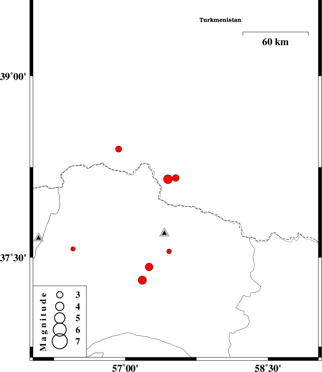 | 2013/02/12 | 12:26:58.1 | 15:56:58.1 | 37.31 | 57.18 | 25 | ML:3.9 | Khorasan(north) Province, 23 km South-West of Bojnurd | ||
