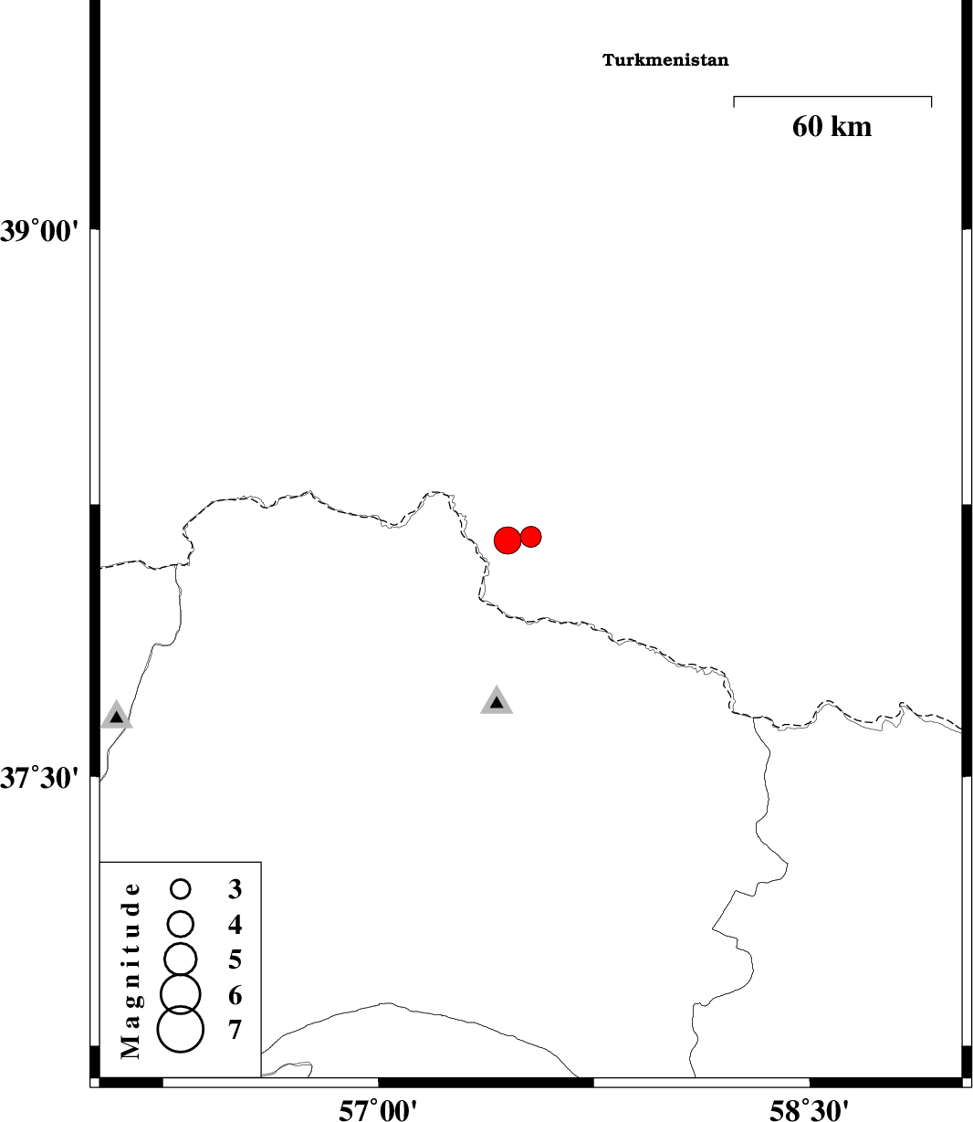 | 2013/02/28 | 11:06:02.4 | 14:36:02.4 | 38.15 | 57.45 | 16 | ML:4.2 | 76 km North-East of Bojnurd |