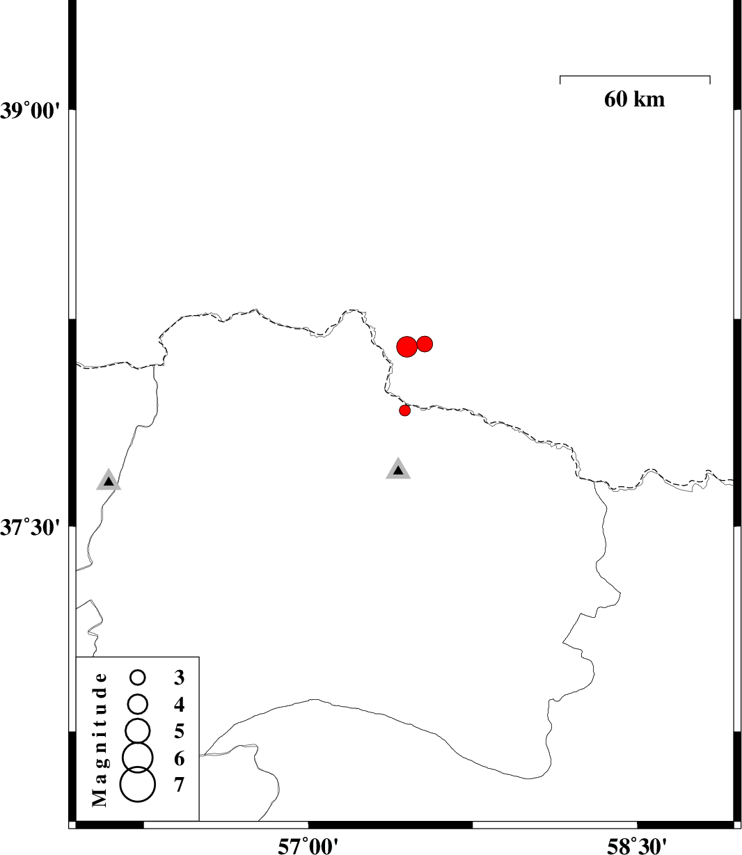 | 2013/03/02 | 00:32:59.9 | 04:02:59.9 | 37.92 | 57.44 | 23 | ML:2.2 | Khorasan(north) Province, 50 km North-East of Bojnurd | ||