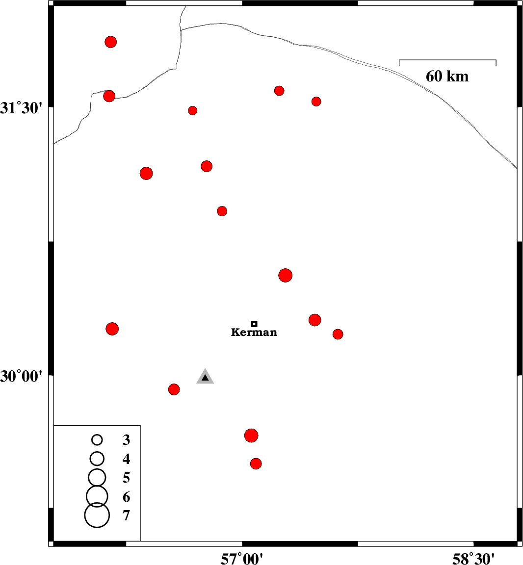 2013/03/03 | 16:11:13.8 | 19:41:13.8 | 30.56 | 57.28 | 14 | ML:3.9 | Kerman Province, 36 km North-East of Kerman | ||
