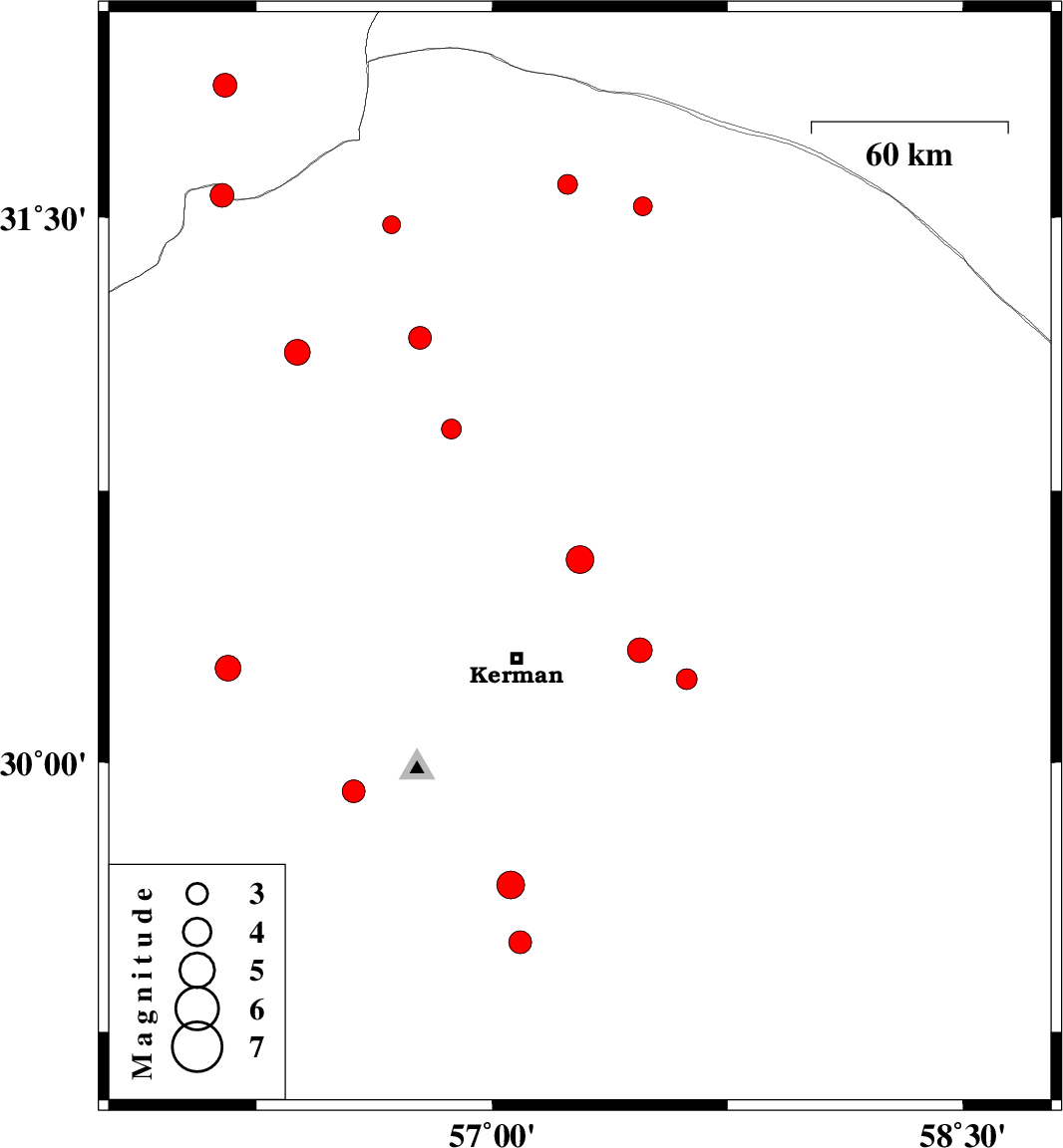 2013/02/10 | 01:56:27.8 | 05:26:27.8 | 30.23 | 57.62 | 18 | ML:2.9 | Kerman Province, 52 km East of Kerman | ||