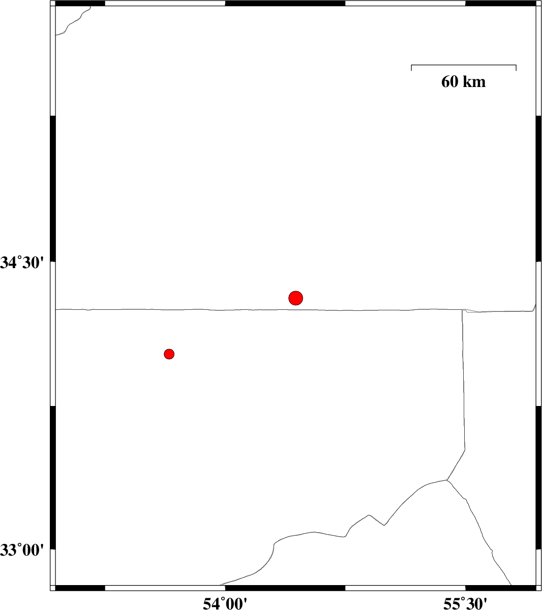 | 2013/02/28 | 02:15:50.8 | 05:45:50.8 | 34.02 | 53.65 | 14 | ML:2.8 | Esfahan Province, 138 km North-East of Nain |
