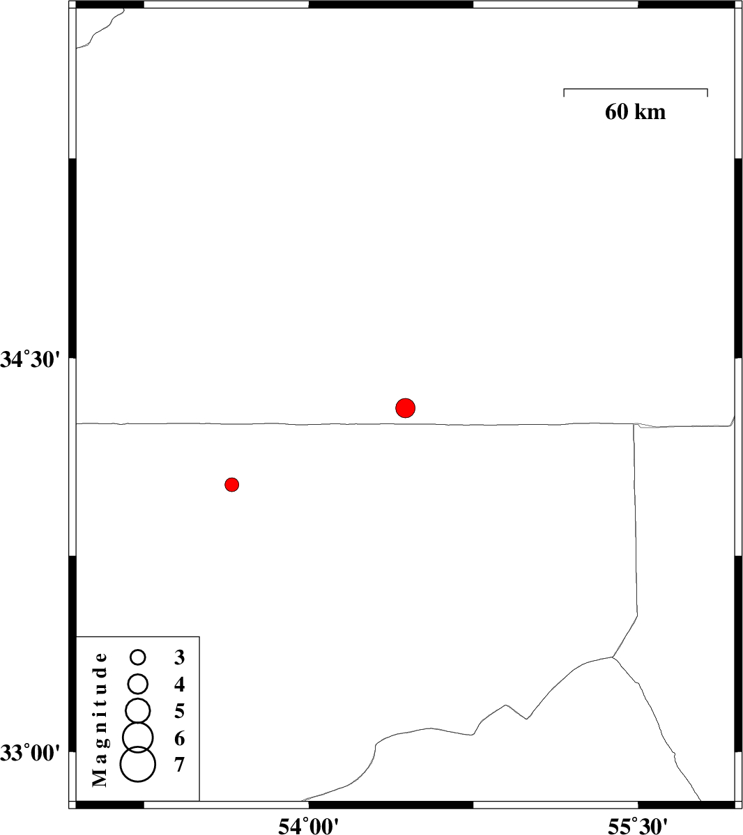 2013/03/04 | 09:47:53.7 | 13:17:53.7 | 34.31 | 54.44 | 15 | ML:3.9 | Semnan Province, 206 km South of Damghan | ||