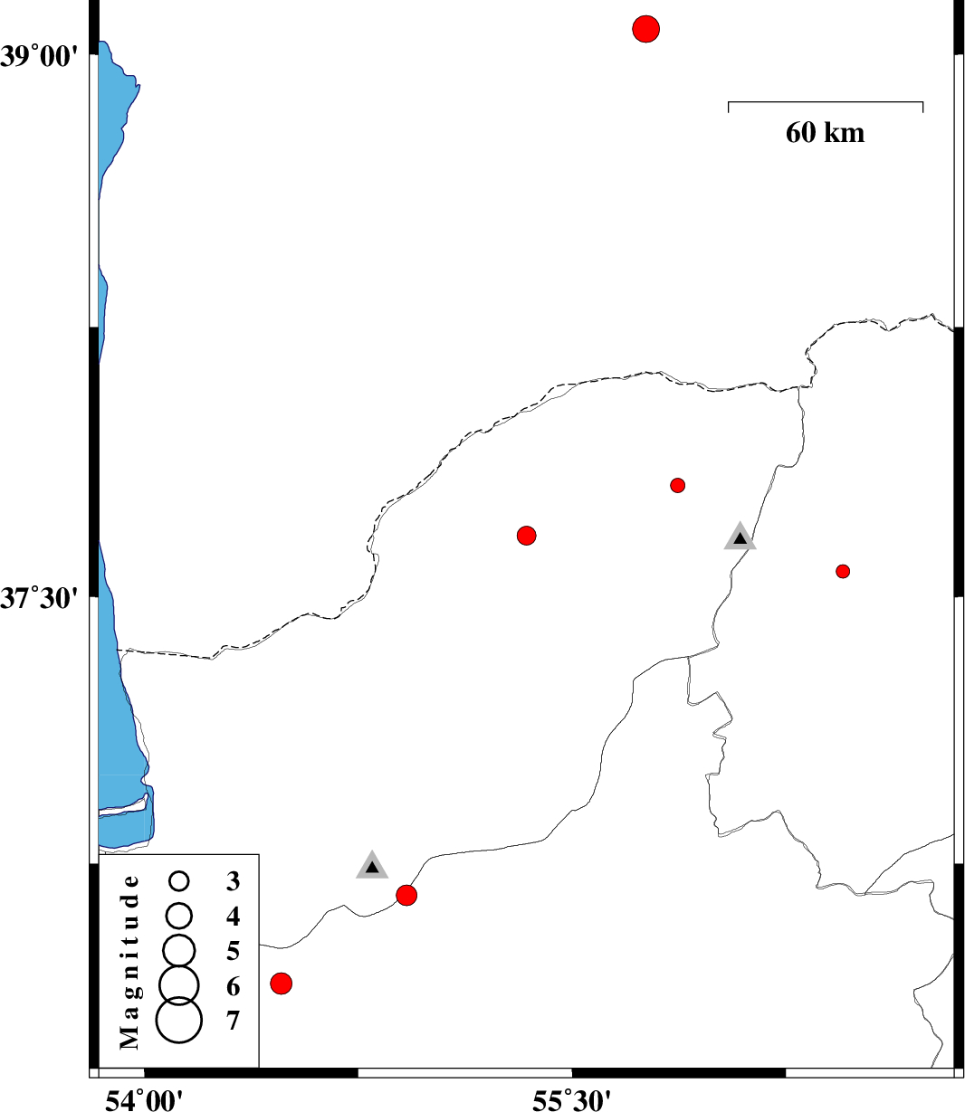 | 2013/02/24 | 01:38:15.4 | 05:08:15.4 | 36.66 | 54.92 | 23 | ML:3.3 | Semnan Province, 27 km North of Shahrud | ||