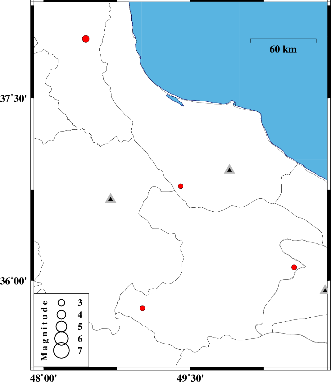 | 2013/03/06 | 05:46:07.2 | 09:16:07.2 | 36.78 | 49.4 | 14 | ML:2.3 | Gilan Province, 5 km Rudbar | ||