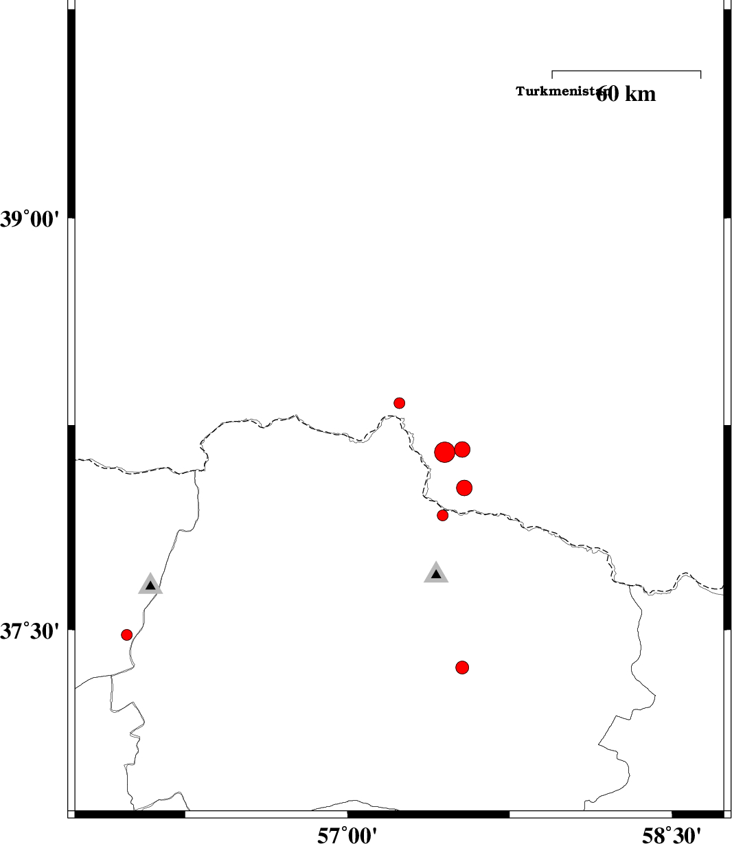 | 2013/03/02 | 00:32:59.9 | 04:02:59.9 | 37.92 | 57.44 | 23 | ML:2.2 | Khorasan(north) Province, 50 km North-East of Bojnurd | ||