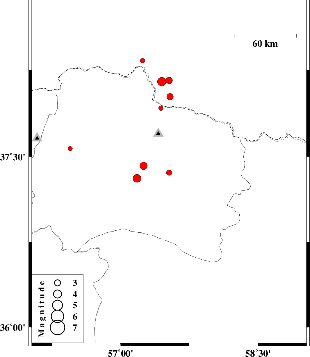 | 2013/03/02 | 00:32:59.9 | 04:02:59.9 | 37.92 | 57.44 | 23 | ML:2.2 | Khorasan(north) Province, 50 km North-East of Bojnurd | ||
