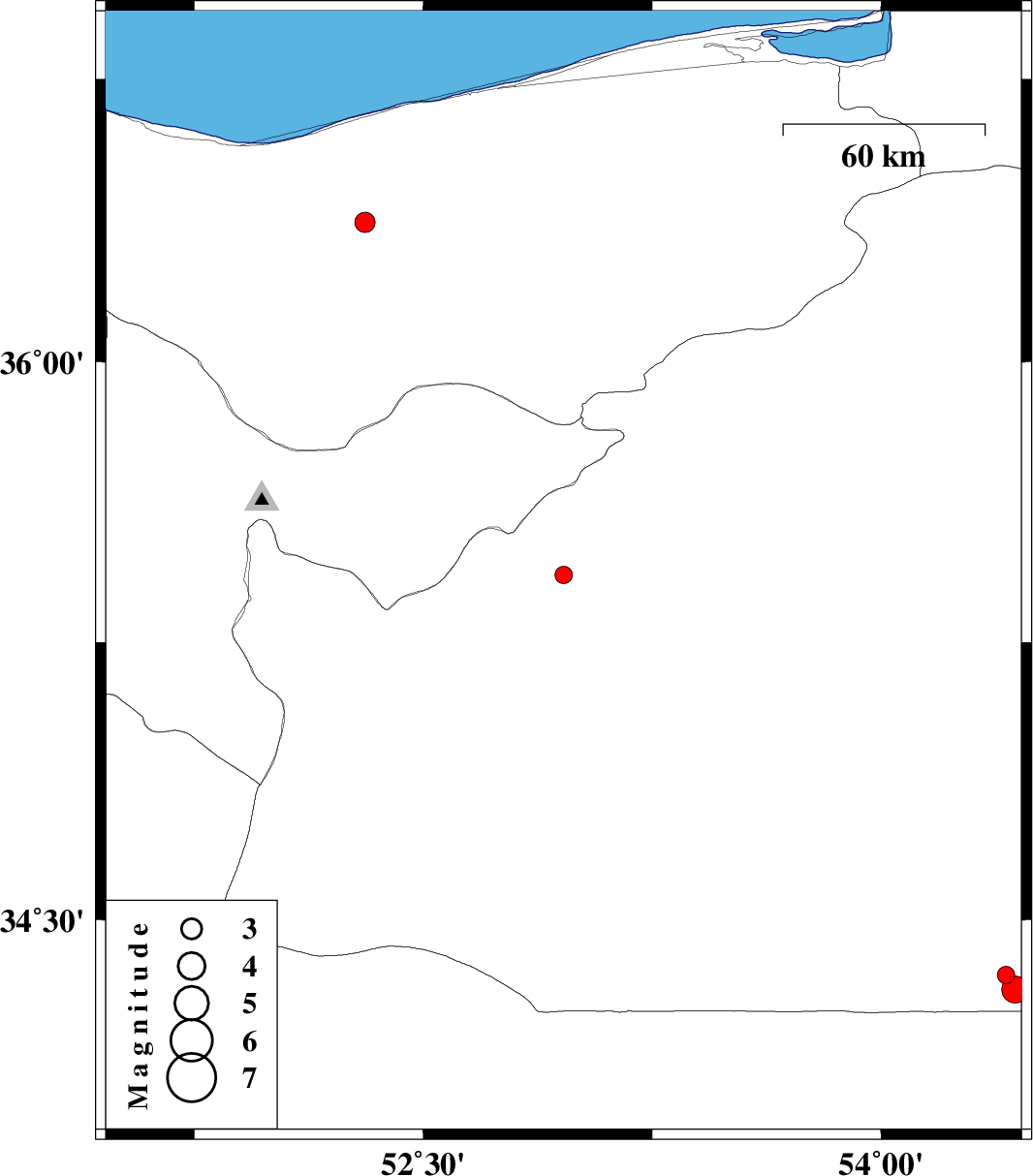 | 2013/03/04 | 09:47:53.7 | 13:17:53.7 | 34.31 | 54.44 | 15 | ML:3.9 | Semnan Province, 206 km South of Damghan | ||