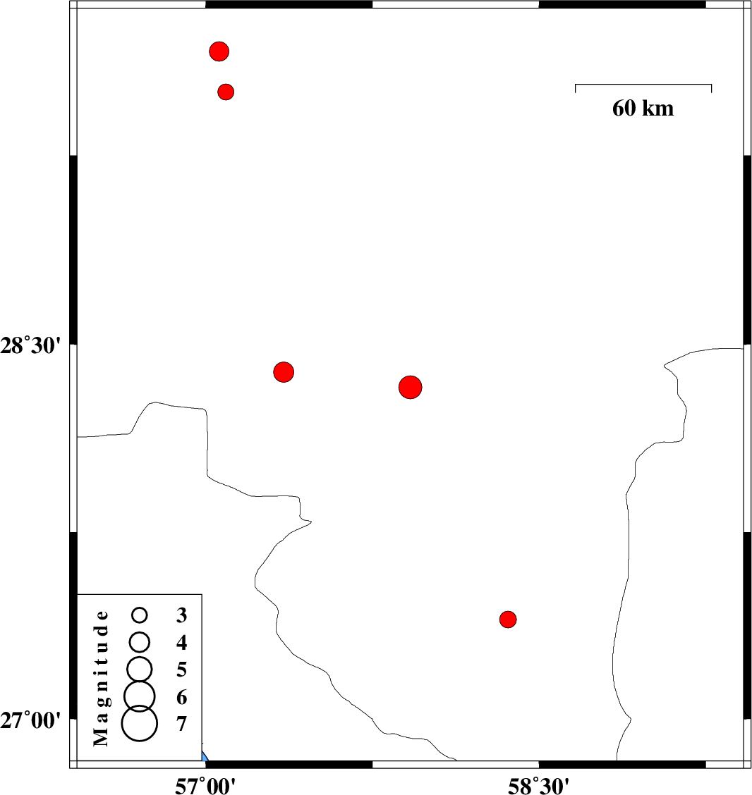 | 2013/02/16 | 13:09:05.1 | 16:39:05.1 | 28.39 | 57.35 | 14 | ML:4.1 | Kerman Province, 49 km South-West of Jiroft | ||
