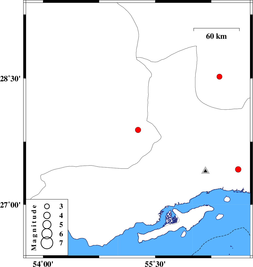 2013/03/09 | 03:25:01.3 | 06:55:01.3 | 27.89 | 55.27 | 18 | ML:3.4 | Fars Province, 78 km South-West of Hajiabad | ||