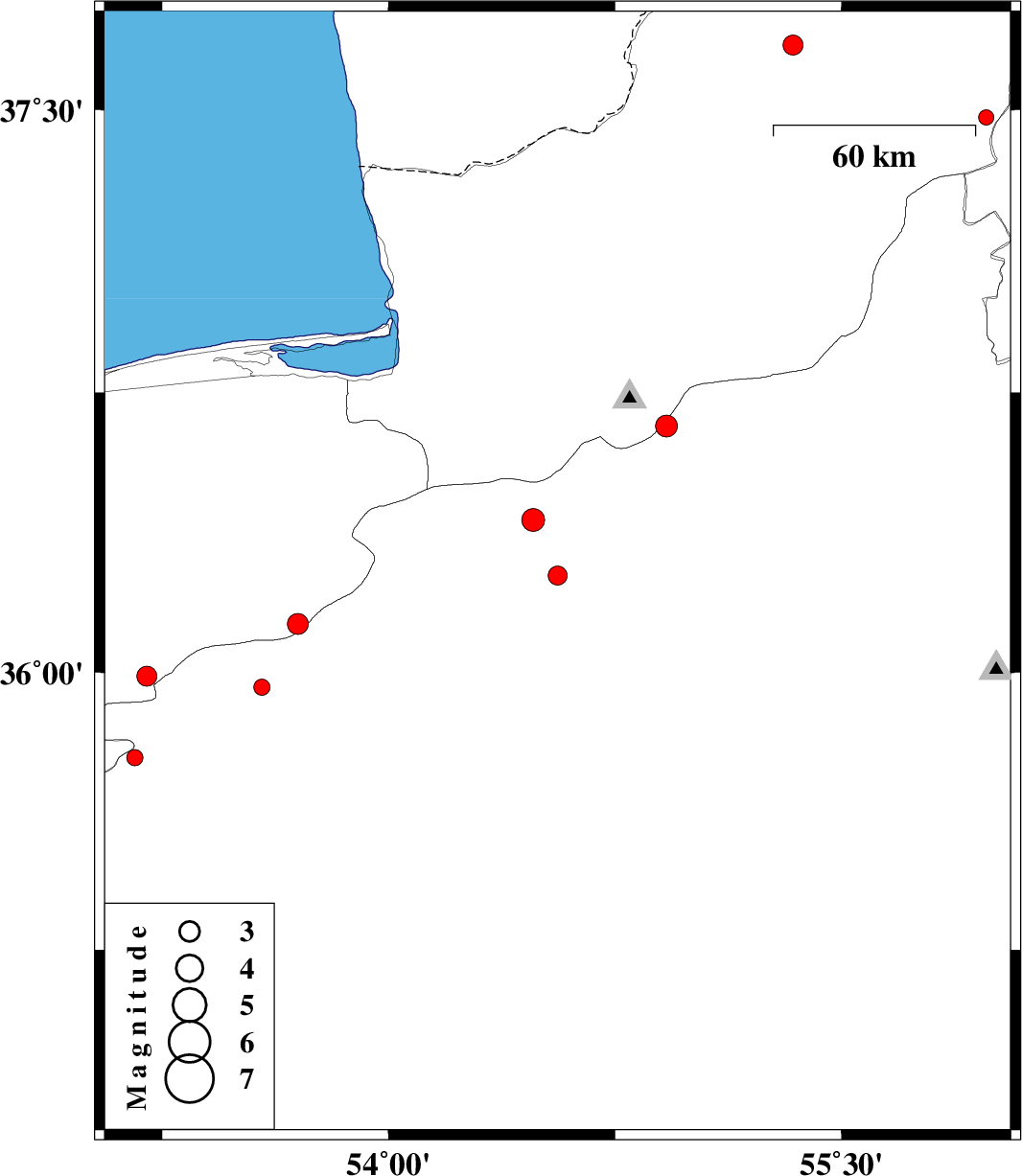 | 2013/02/24 | 01:38:15.4 | 05:08:15.4 | 36.66 | 54.92 | 23 | ML:3.3 | Semnan Province, 27 km North of Shahrud | ||