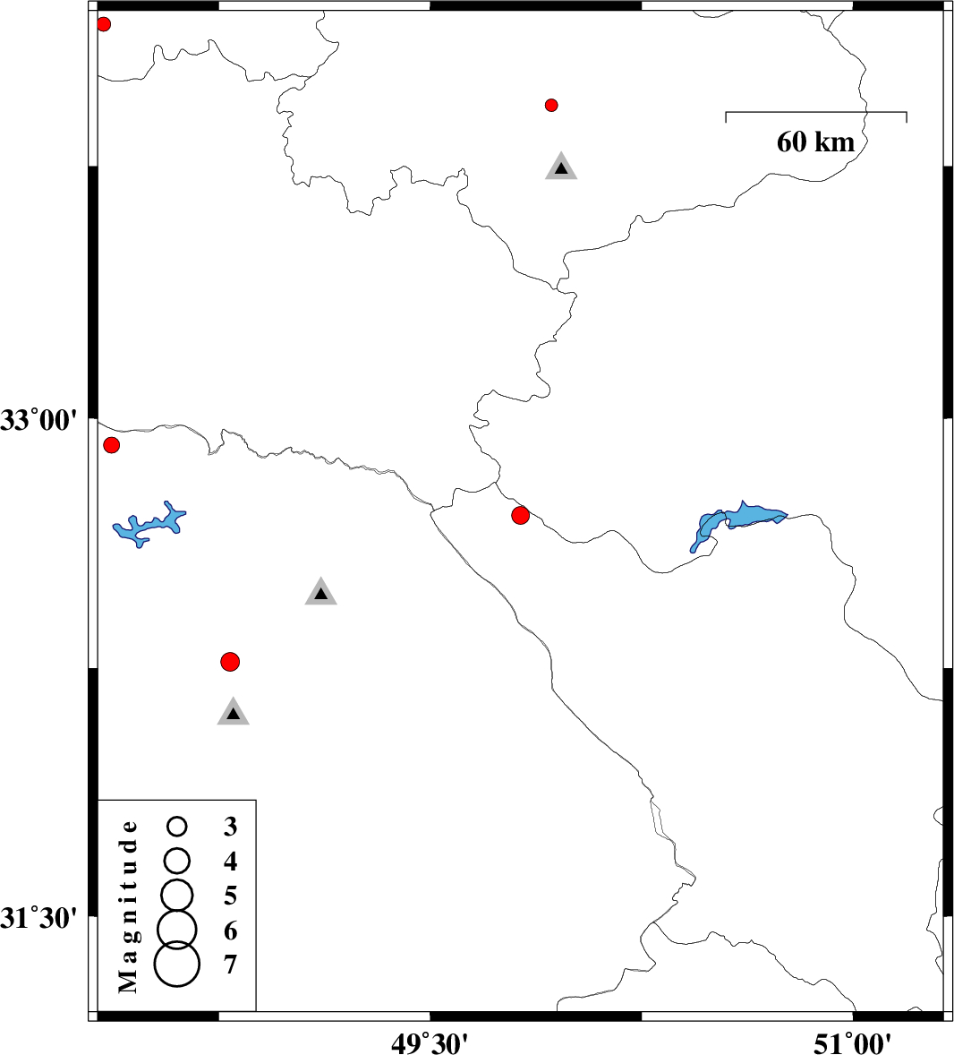 | 2013/03/11 | 12:24:30.7 | 15:54:30.7 | 32.71 | 49.82 | 14 | ML:2.8 | Chaharmahal Bakhtiari Province, 37 km South-West of Fereydunshahr | ||