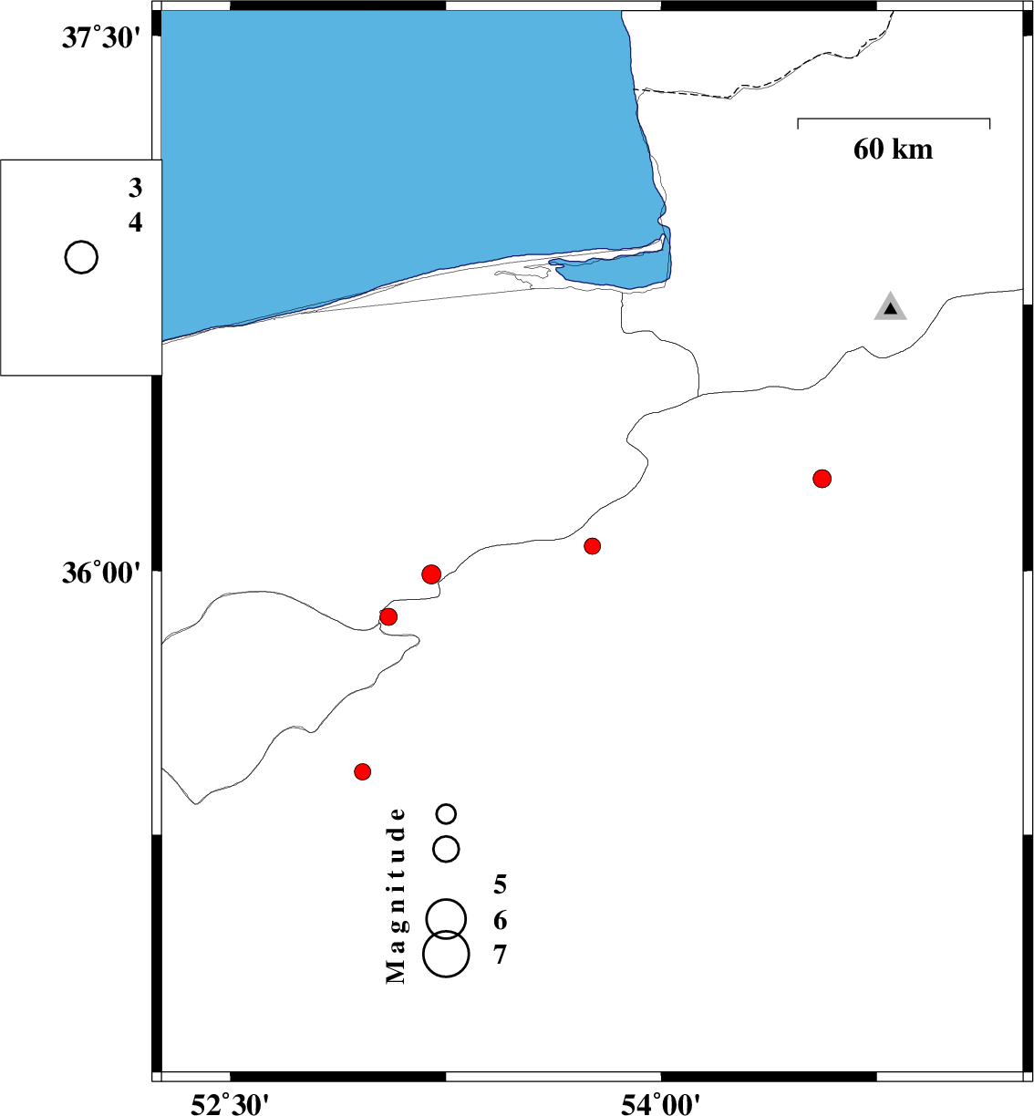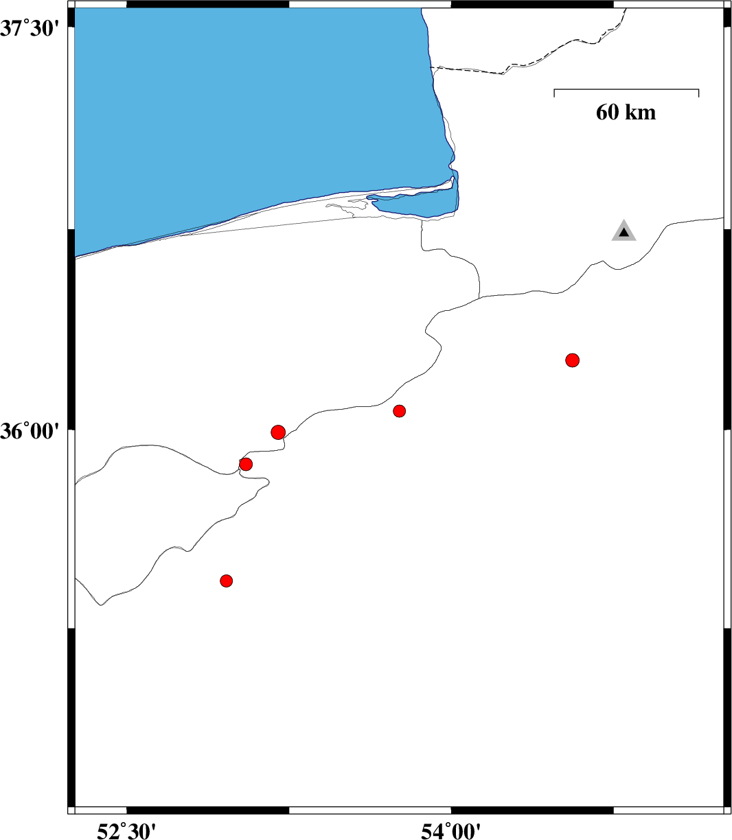 | 2013/03/10 | 06:41:06.7 | 10:11:06.7 | 35.99 | 53.2 | 16 | ML:2.9 | Mazandaran Province, 19 km South-East of Pol-E-Sefid | ||