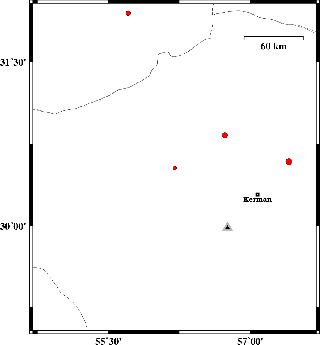 2013/03/07 | 14:18:11.8 | 17:48:11.8 | 30.83 | 56.73 | 14 | ML:2.5 | Kerman Province, 15 km East of Zarand |
