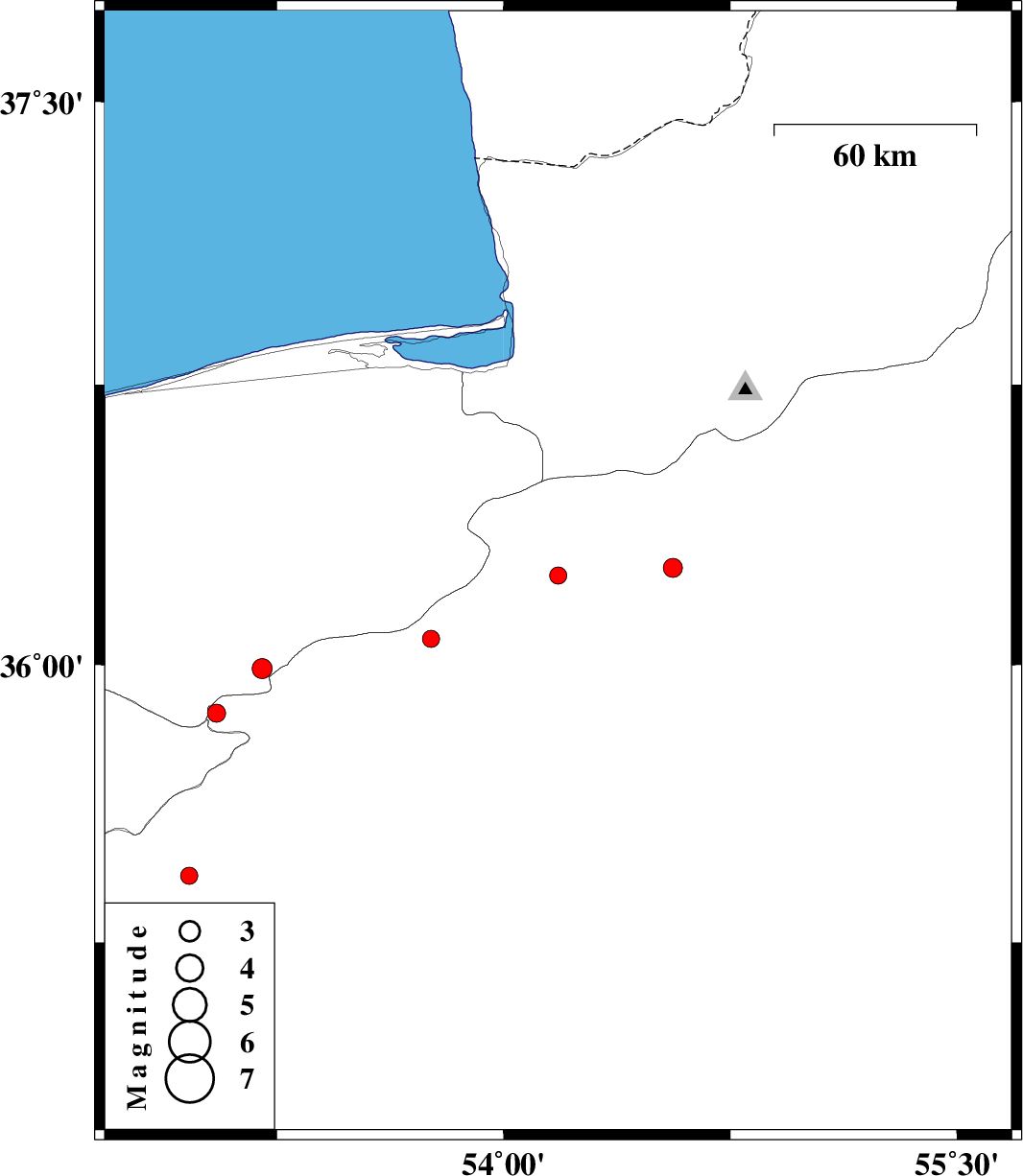 | 2013/03/15 | 02:03:12.0 | 05:33:12.0 | 36.24 | 54.18 | 31 | ML:2.6 | Semnan Province, 17 km West of Damghan | ||