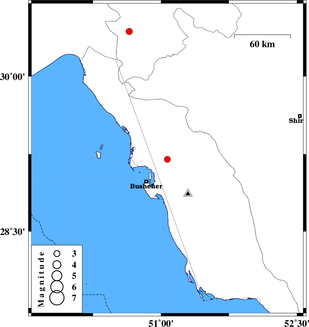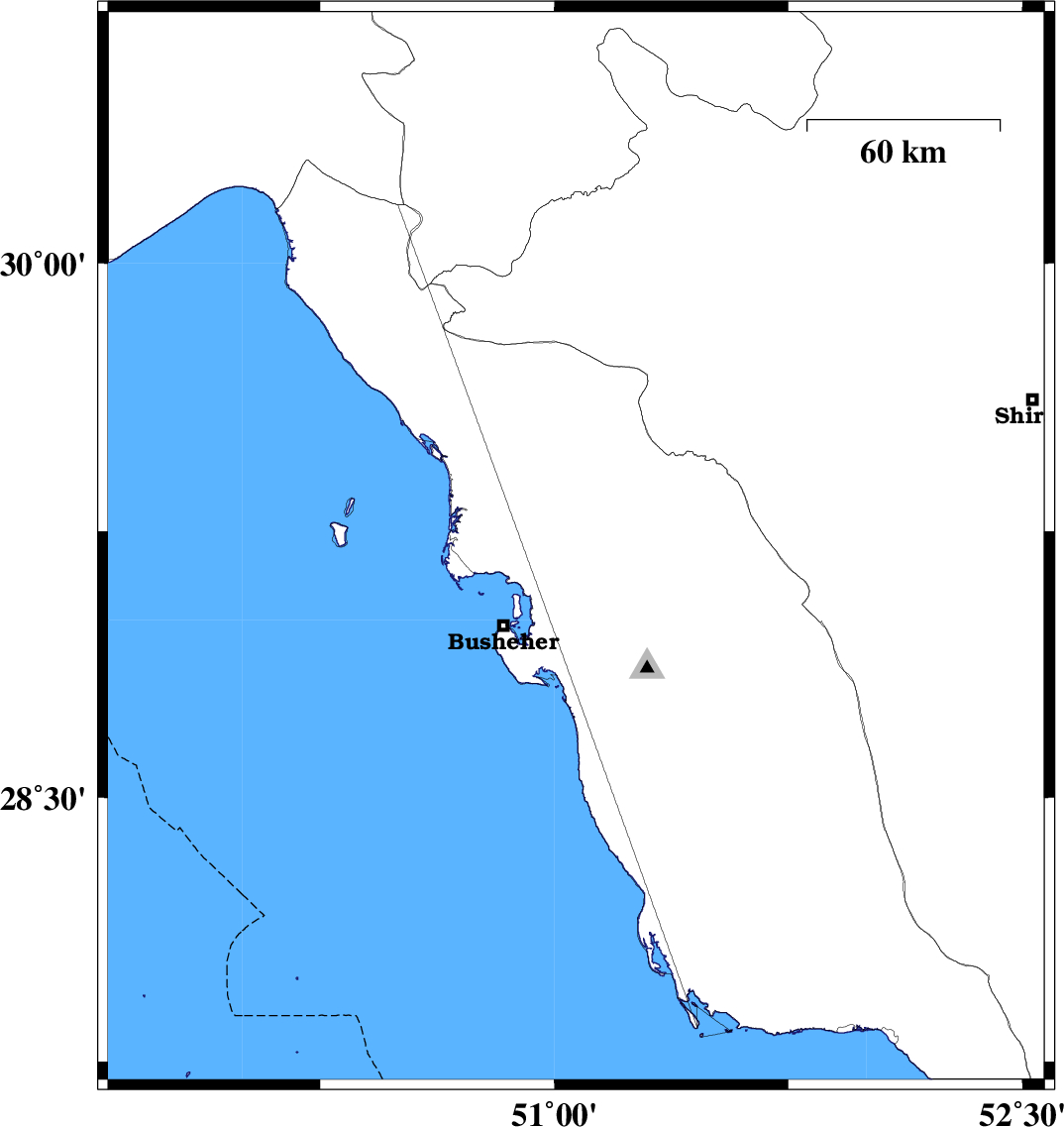 | 2013/03/16 | 19:33:38.1 | 23:03:38.1 | 29.2 | 51.07 | 17 | ML:3.1 | Bushehr Province, 15 km West of Borazjan | ||