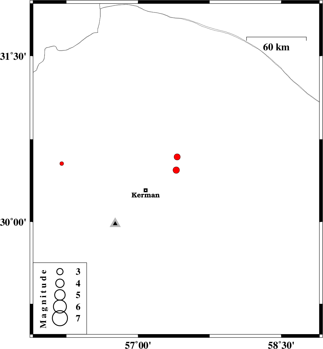 2013/03/13 | 09:16:47.3 | 12:46:47.3 | 30.59 | 57.41 | 14 | ML:2.9 | Kerman Province, 46 km North-East of Kerman |