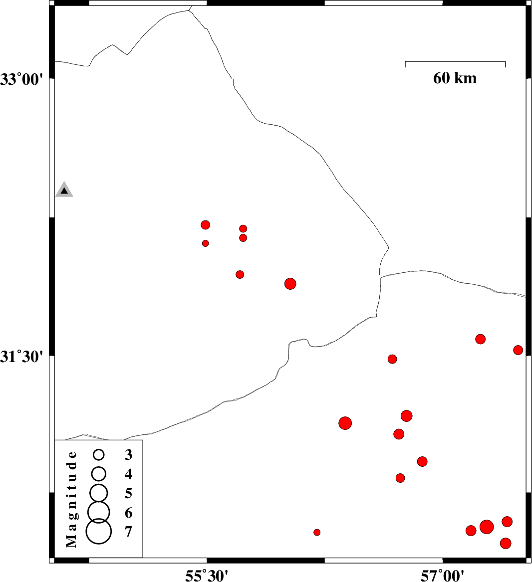 2013/02/19 | 00:03:50.5 | 03:33:50.5 | 30.92 | 56.87 | 14 | ML:2.8 | Kerman Province, 39 km South of Ravar | ||