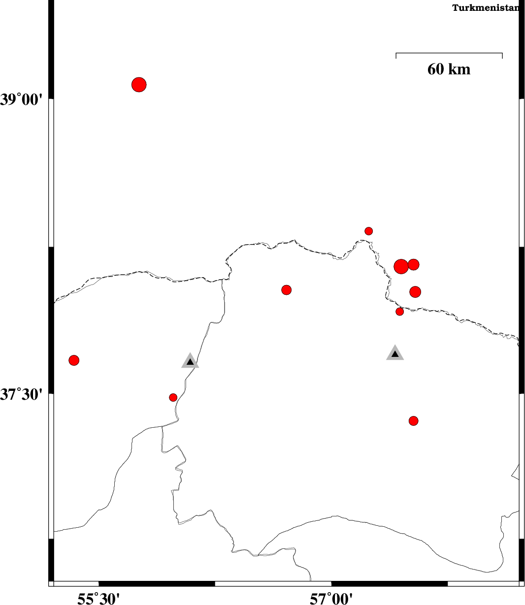 2013/03/02 | 00:32:59.9 | 04:02:59.9 | 37.92 | 57.44 | 23 | ML:2.2 | Khorasan(north) Province, 50 km North-East of Bojnurd | ||