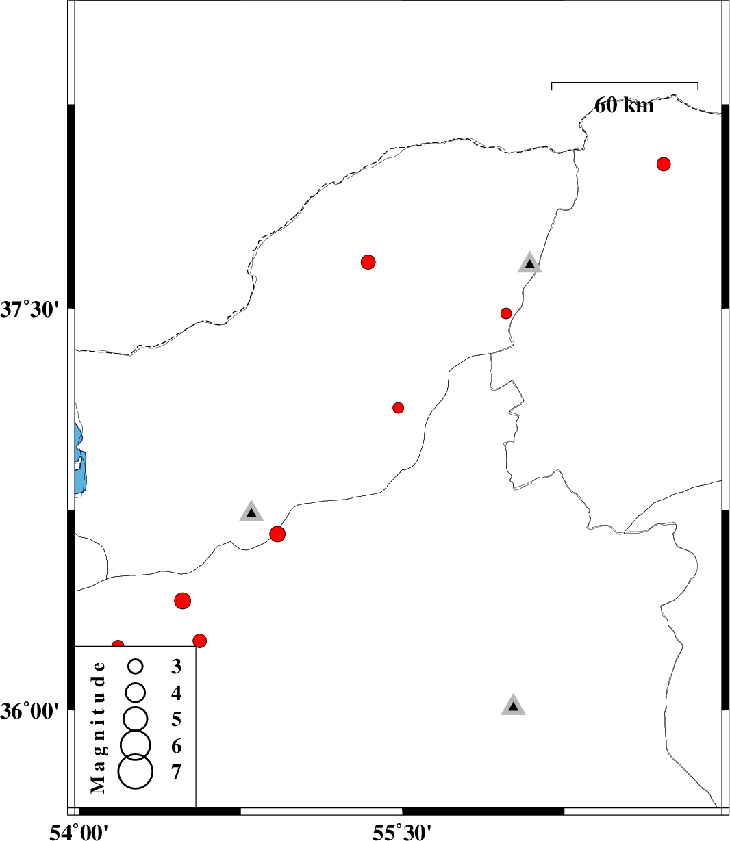 | 2013/02/24 | 01:38:15.4 | 05:08:15.4 | 36.66 | 54.92 | 23 | ML:3.3 | Semnan Province, 27 km North of Shahrud |