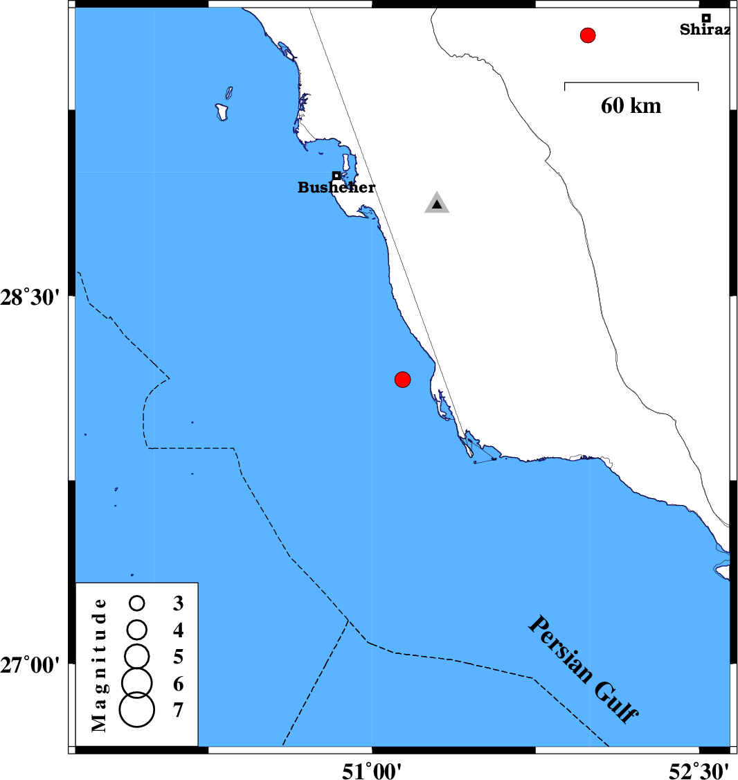 | 2013/03/26 | 01:59:34.7 | 06:29:34.7 | 28.16 | 51.14 | 18 | ML:3.2 | Persian Gulf, 59 km South-West of Khormog | ||