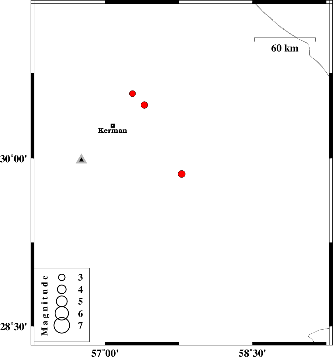 2013/03/19 | 17:39:53.5 | 21:09:53.5 | 30.47 | 57.4 | 18 | ML:3.1 | Kerman Province, 37 km North-East of Kerman |