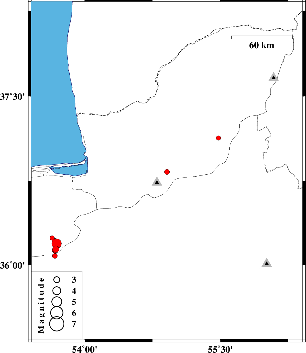 | 2013/03/21 | 19:37:04.7 | 23:07:04.7 | 36.19 | 53.69 | 14 | ML:4.8 | Mazandaran Province, 58 km South-East of Behshahr | ||