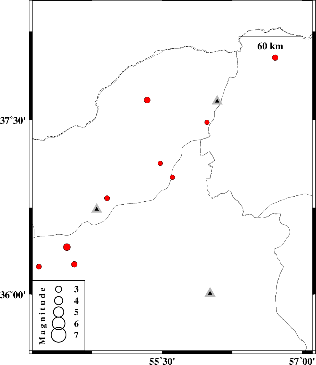 | 2013/03/05 | 15:48:40.3 | 19:18:40.3 | 37.67 | 55.34 | 14 | ML:2.9 | Golestan Province, 35 km North-West of Kalaleh | ||