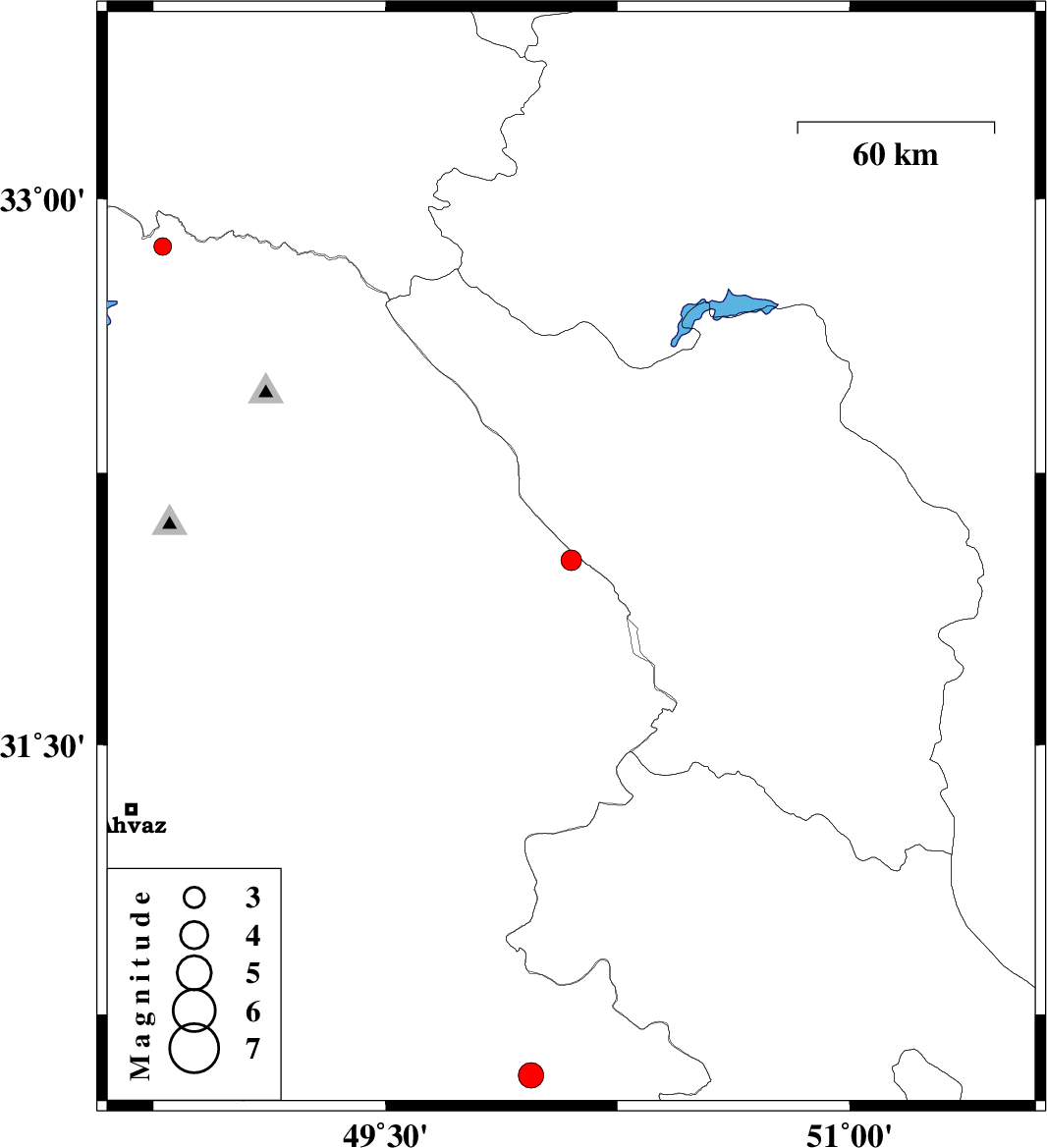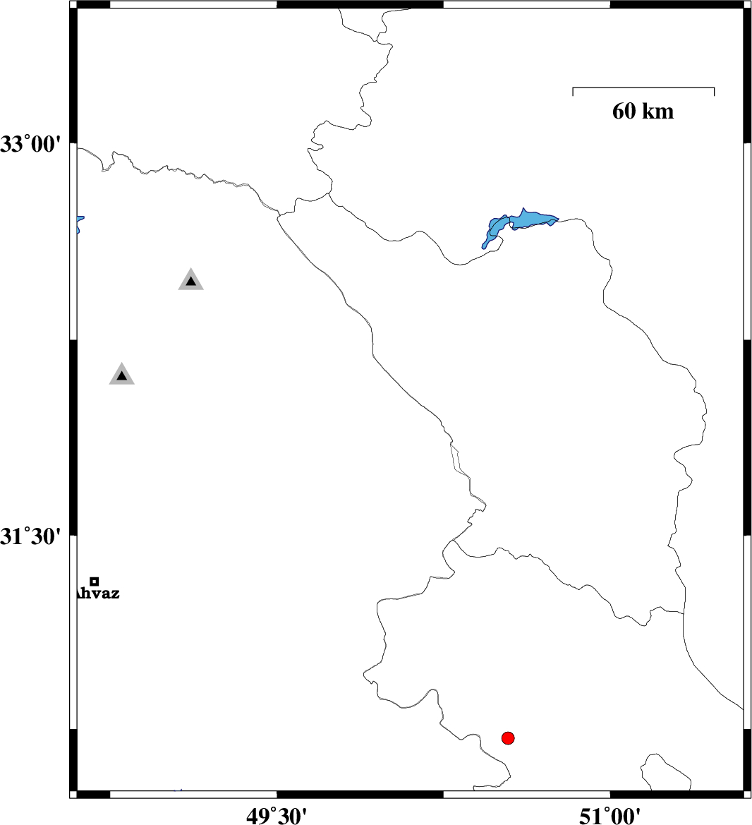| 2013/03/21 | 17:45:12.7 | 21:15:12.7 | 30.58 | 49.97 | 27 | ML:3.6 | Khoozestan Province, 26 km West of Behbahan | ||