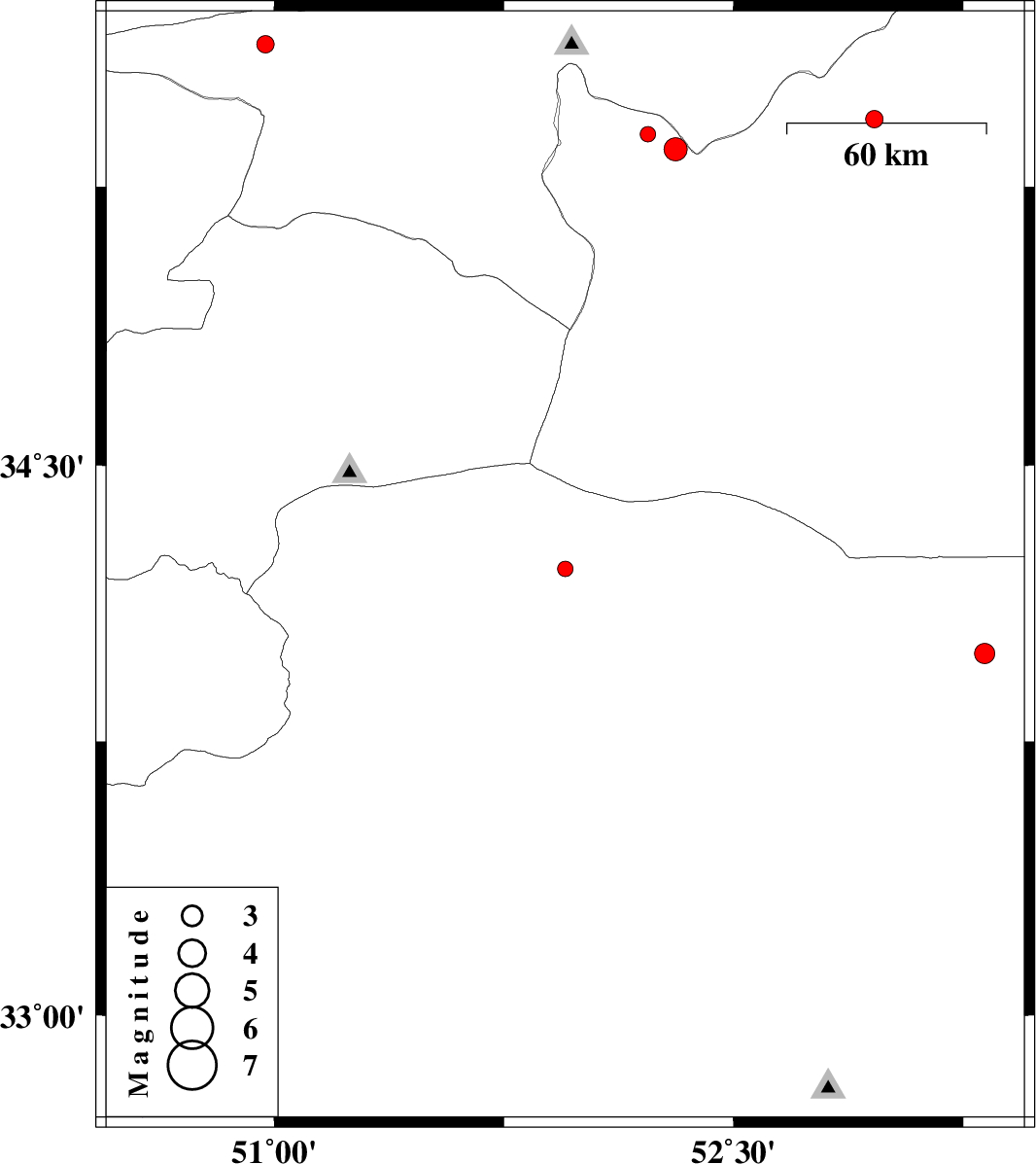 | 2013/03/16 | 07:33:33.0 | 11:03:33.0 | 35.35 | 52.31 | 6 | ML:3.4 | Semnan Province, 15 km North of Garmsar | ||