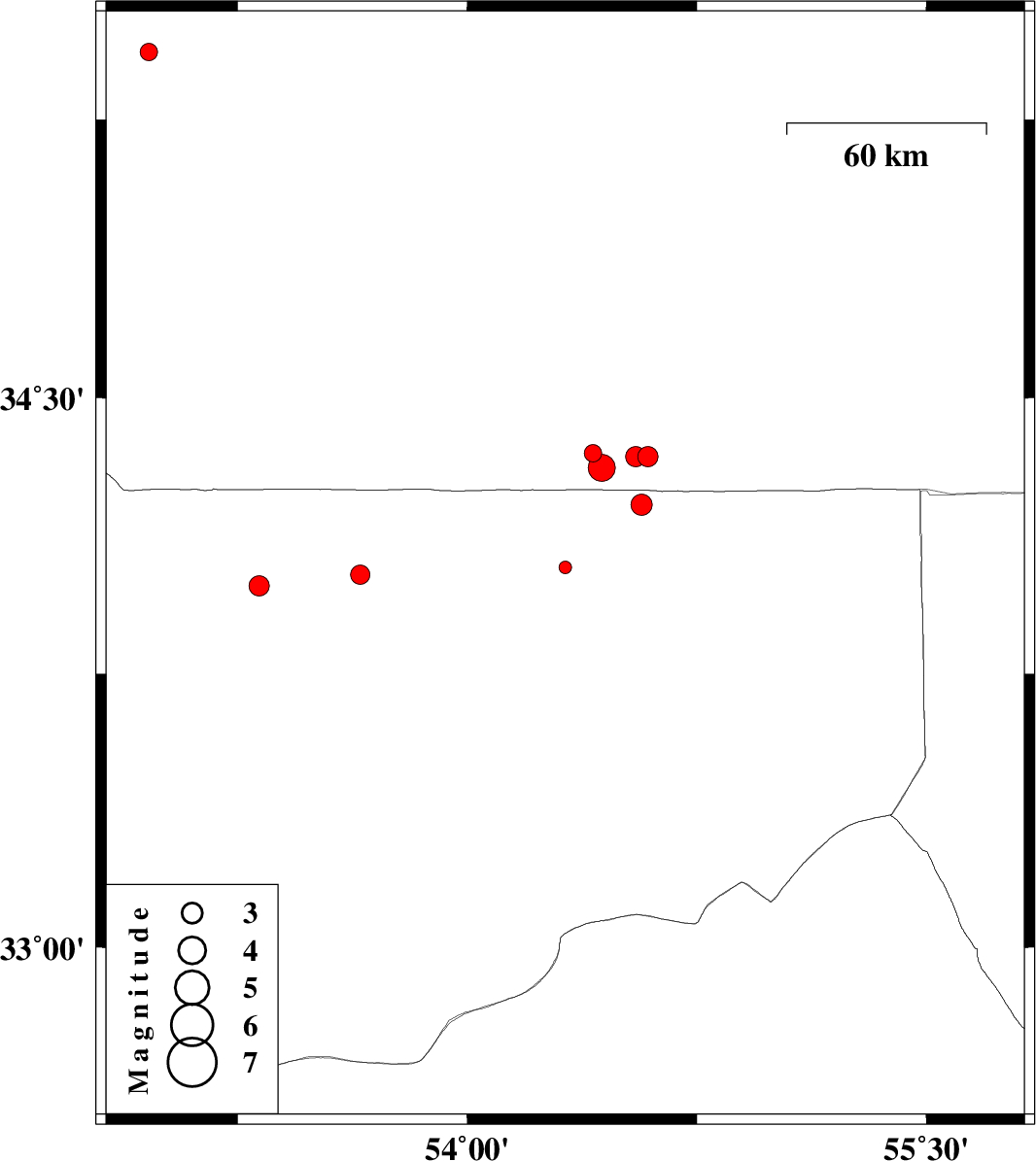 | 2013/03/05 | 12:29:51.2 | 15:59:51.2 | 34.34 | 54.55 | 15 | ML:2.9 | Semnan Province, 204 km South-East of Damghan | ||