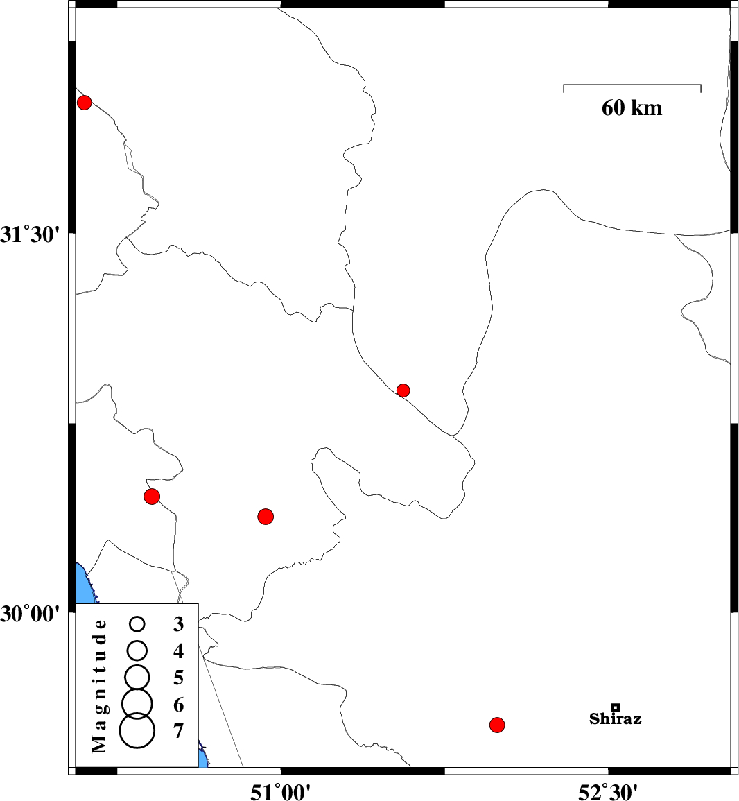 | 2013/03/23 | 11:02:39.8 | 15:32:39.8 | 29.55 | 51.99 | 17 | ML:3.1 | Fars Province, 33 km East of Kazerun |