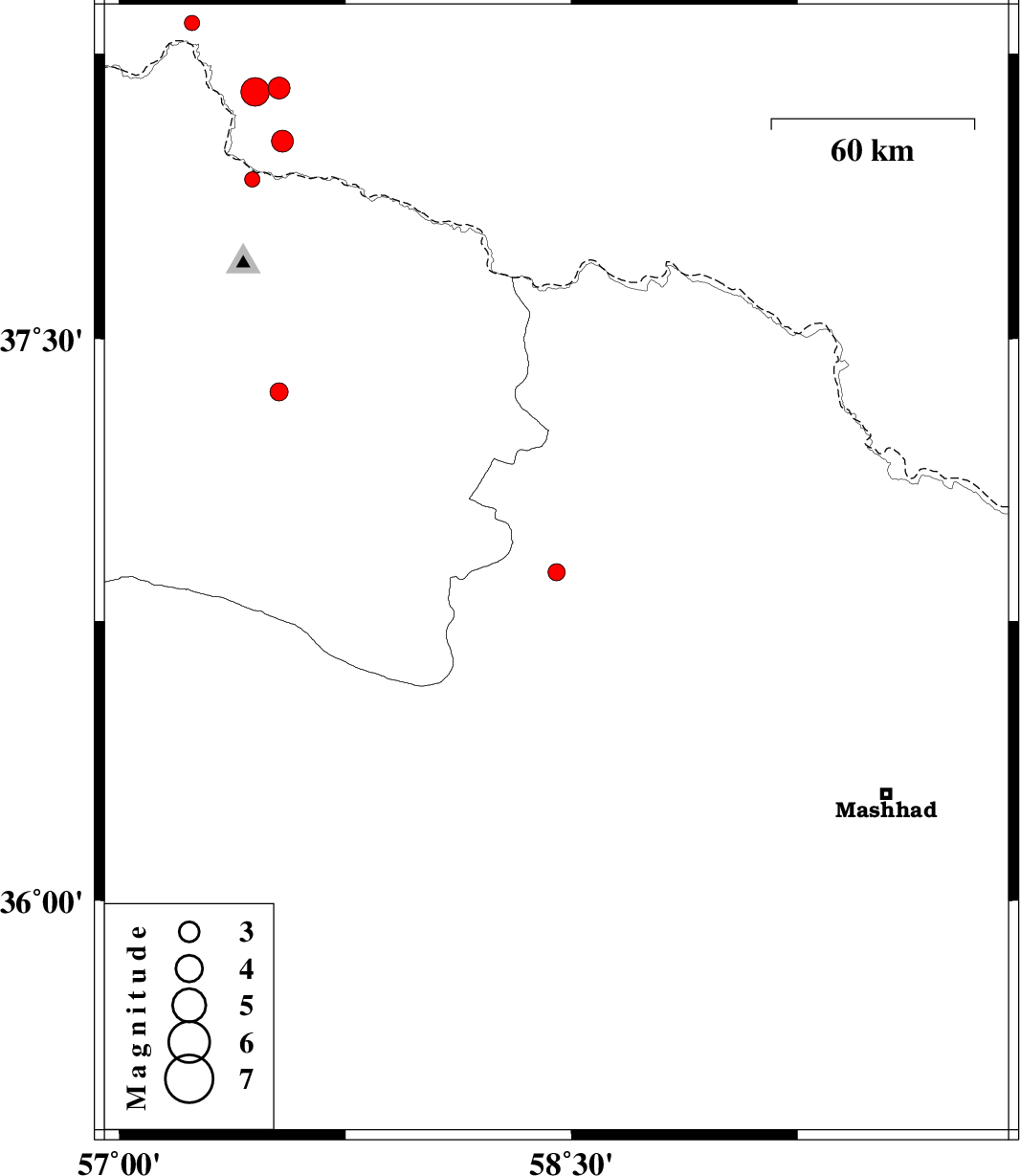| 2013/03/02 | 00:32:59.9 | 04:02:59.9 | 37.92 | 57.44 | 23 | ML:2.2 | Khorasan(north) Province, 50 km North-East of Bojnurd | ||