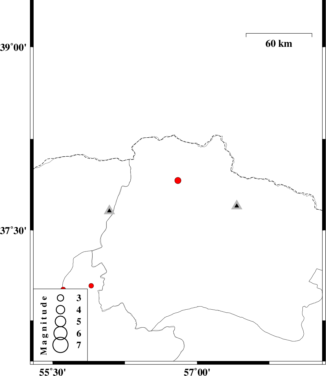 | 2013/04/03 | 01:49:02.3 | 06:19:02.3 | 37.91 | 56.8 | 14 | ML:2.9 | Khorasan(north) Province, 42 km North-West of Ashkhaneh | ||