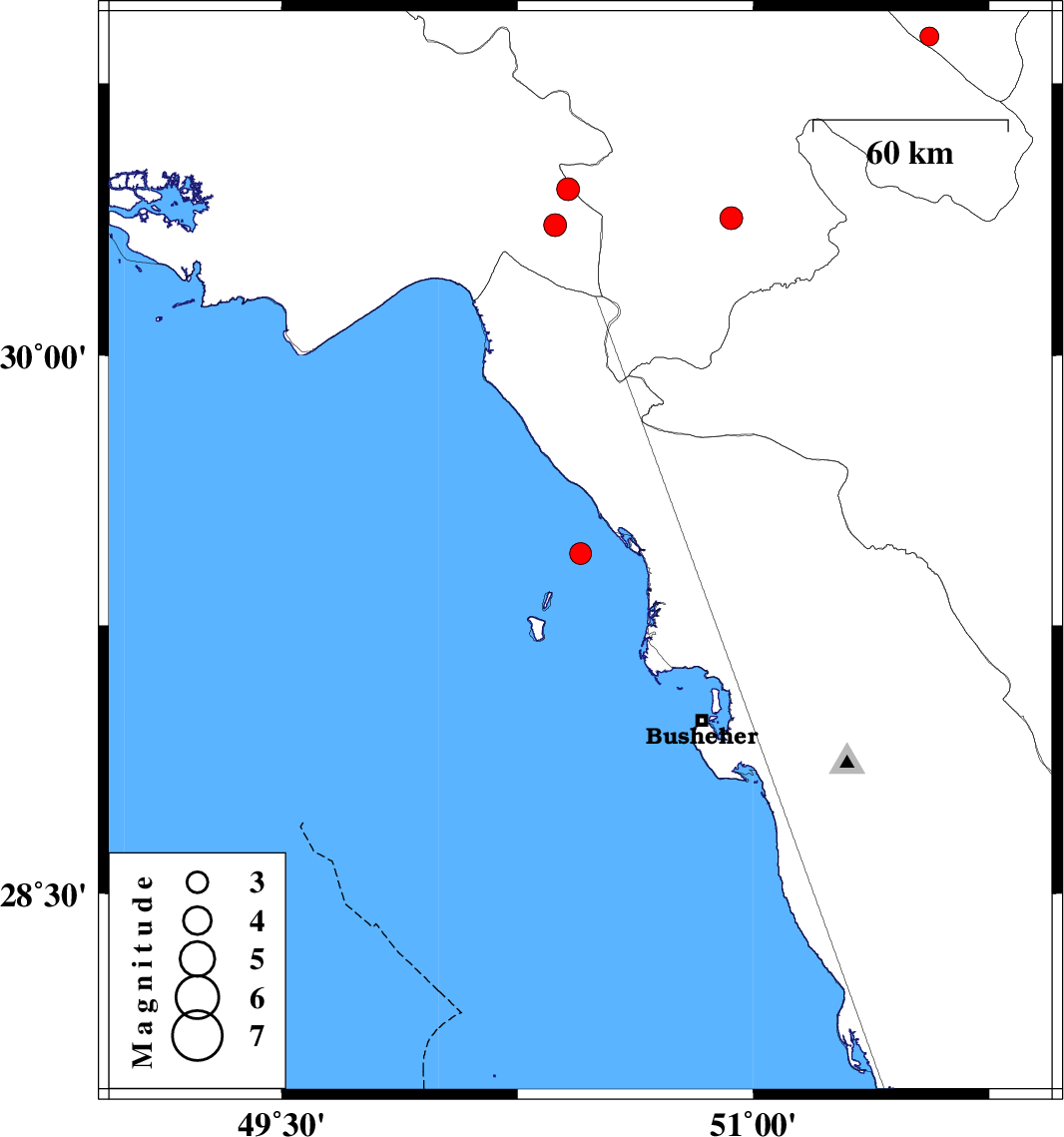 | 2013/04/02 | 00:54:50.5 | 05:24:50.5 | 30.36 | 50.37 | 42 | ML:3.3 | Khoozestan Province, 29 km South-East of Behbahan | ||