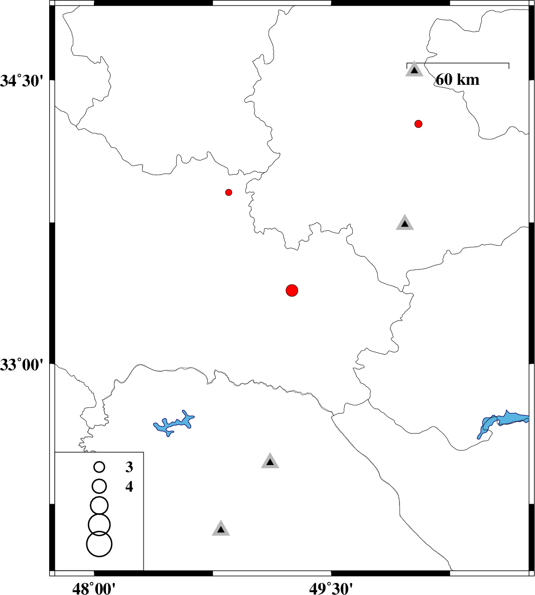 2013/04/04 | 15:55:13.2 | 20:25:13.2 | 33.39 | 49.25 | 14 | ML:3.4 | Lorestan Province, 20 km East of Dorud | ||