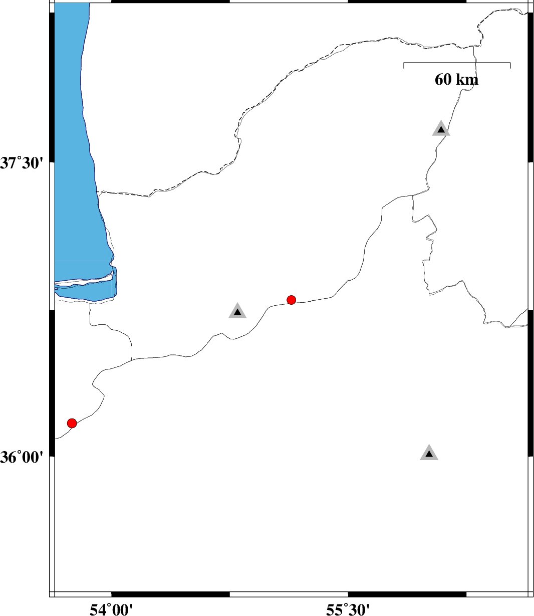 2013/04/05 | 06:35:07.4 | 11:05:07.4 | 36.8 | 55.14 | 46 | ML:2.6 | Golestan Province, 23 km South of Ramian | ||