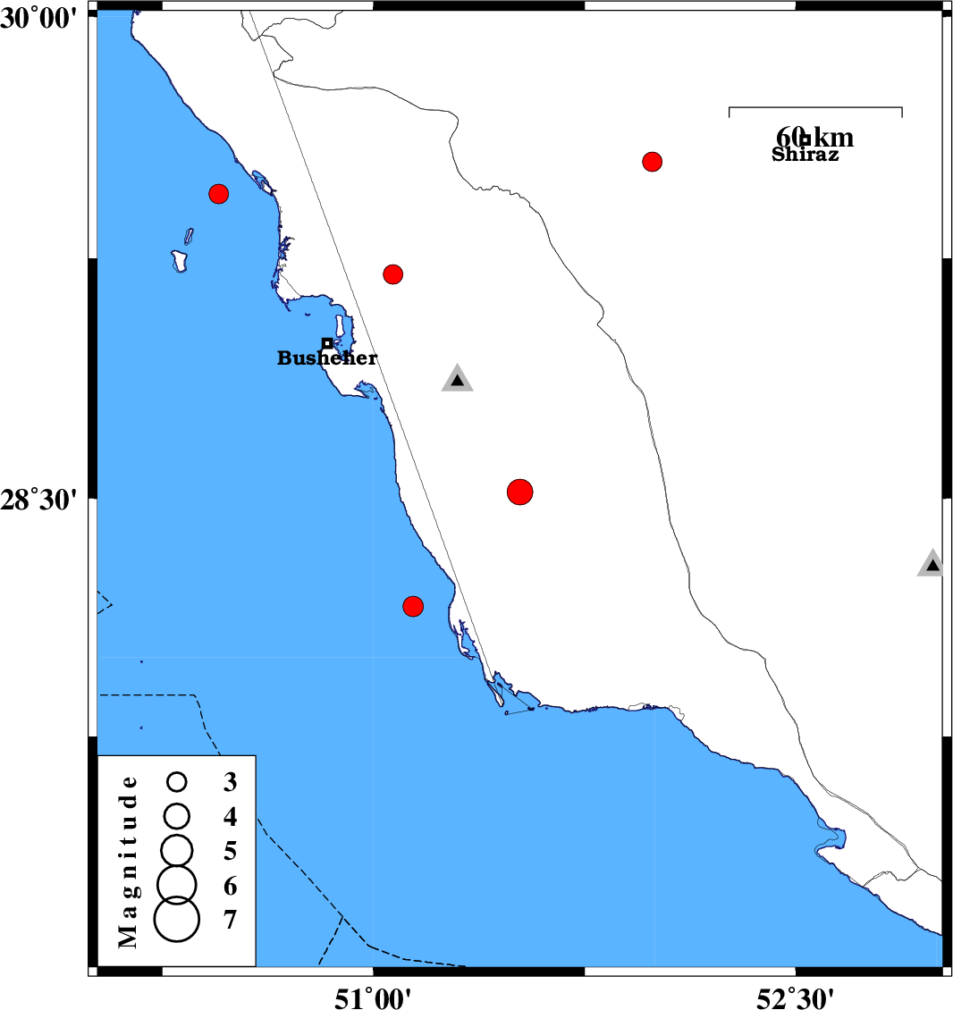 | 2013/03/16 | 19:33:38.1 | 23:03:38.1 | 29.2 | 51.07 | 17 | ML:3.1 | Bushehr Province, 15 km West of Borazjan |