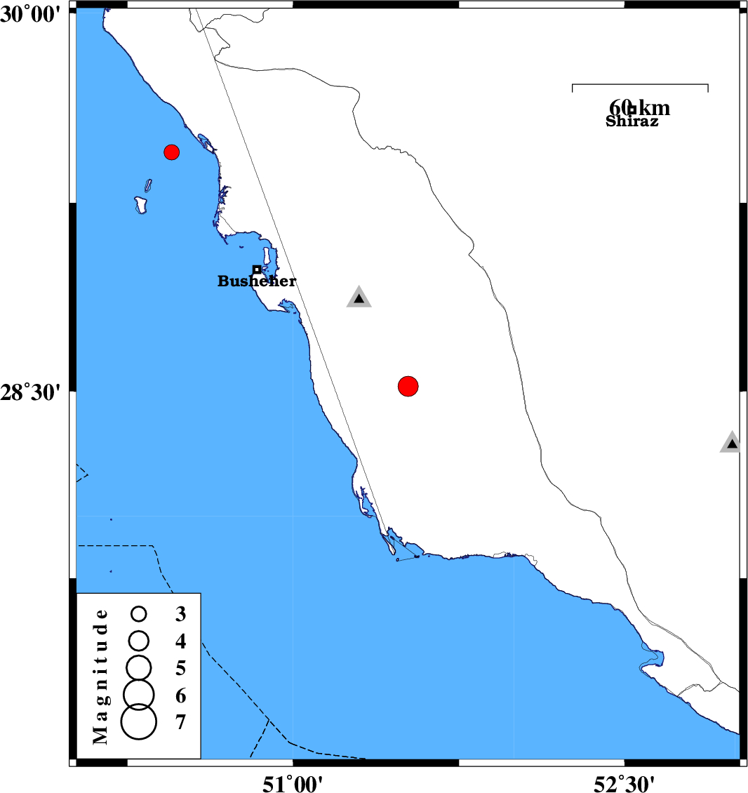 | 2013/04/07 | 04:34:00.8 | 09:04:00.8 | 28.52 | 51.52 | 21 | ML:4.1 | Bushehr Province, 21 km South-East of Khormog | ||