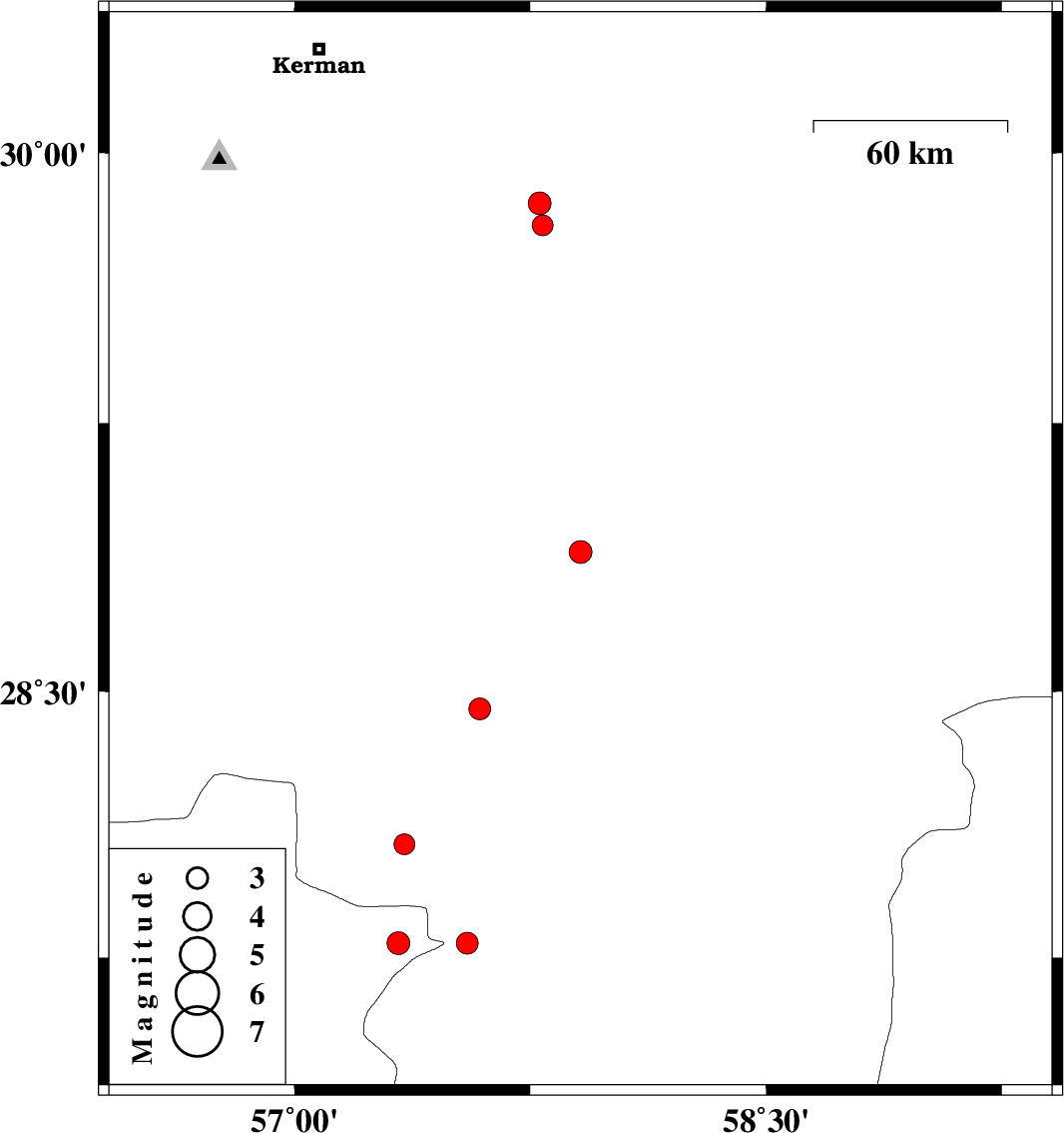 2013/03/11 | 13:30:43.4 | 17:00:43.4 | 29.8 | 57.79 | 14 | ML:3 | Kerman Province, 126 km North of Jiroft |