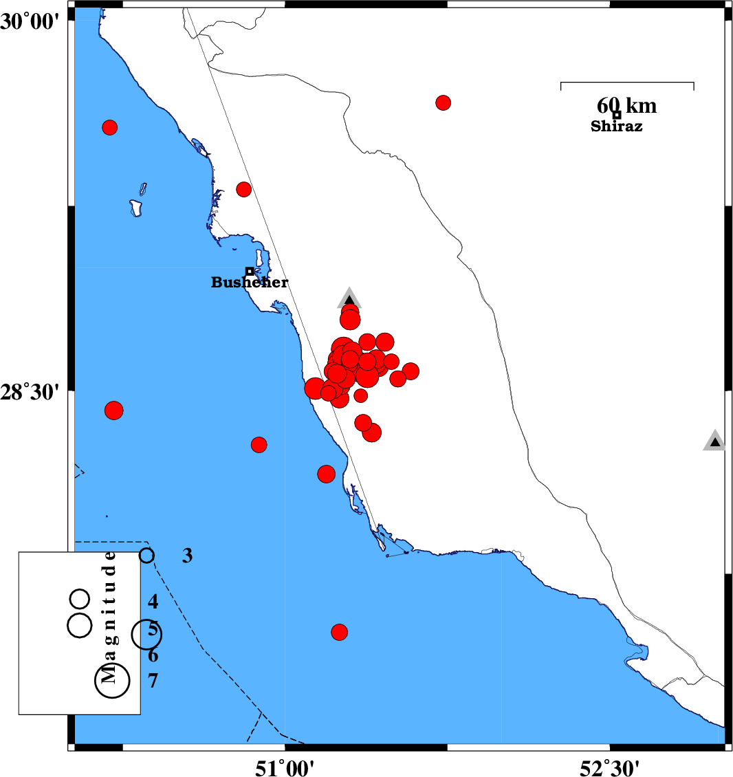 2013/04/09 | 12:05:41.5 | 16:35:41.5 | 28.55 | 51.53 | 36 | ML:5.1 | Bushehr Province, 19 km South-East of Khormog | ||