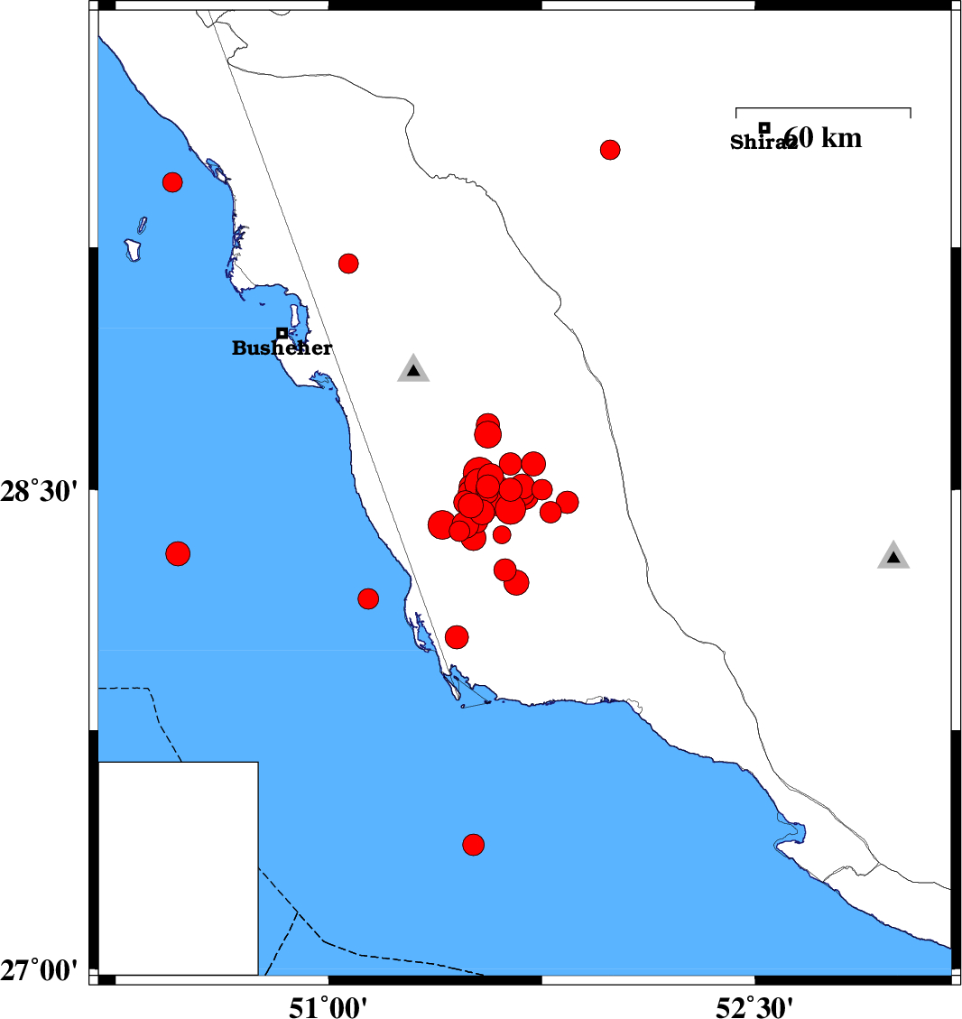 2013/04/09 | 12:05:41.5 | 16:35:41.5 | 28.55 | 51.53 | 36 | ML:5.1 | Bushehr Province, 19 km South-East of Khormog | ||