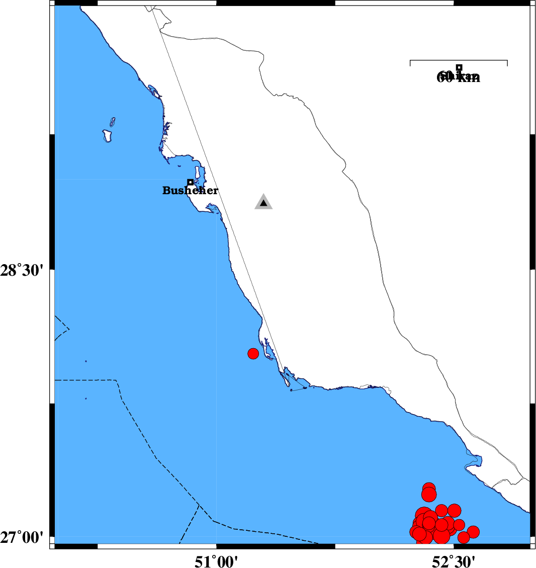 2013/04/09 | 23:43:06.2 | 04:13:06.2 | 27.39 | 51.51 | 25 | ML:3.4 | Persian Gulf, 72 km South-West of Bandar-e kangan | ||